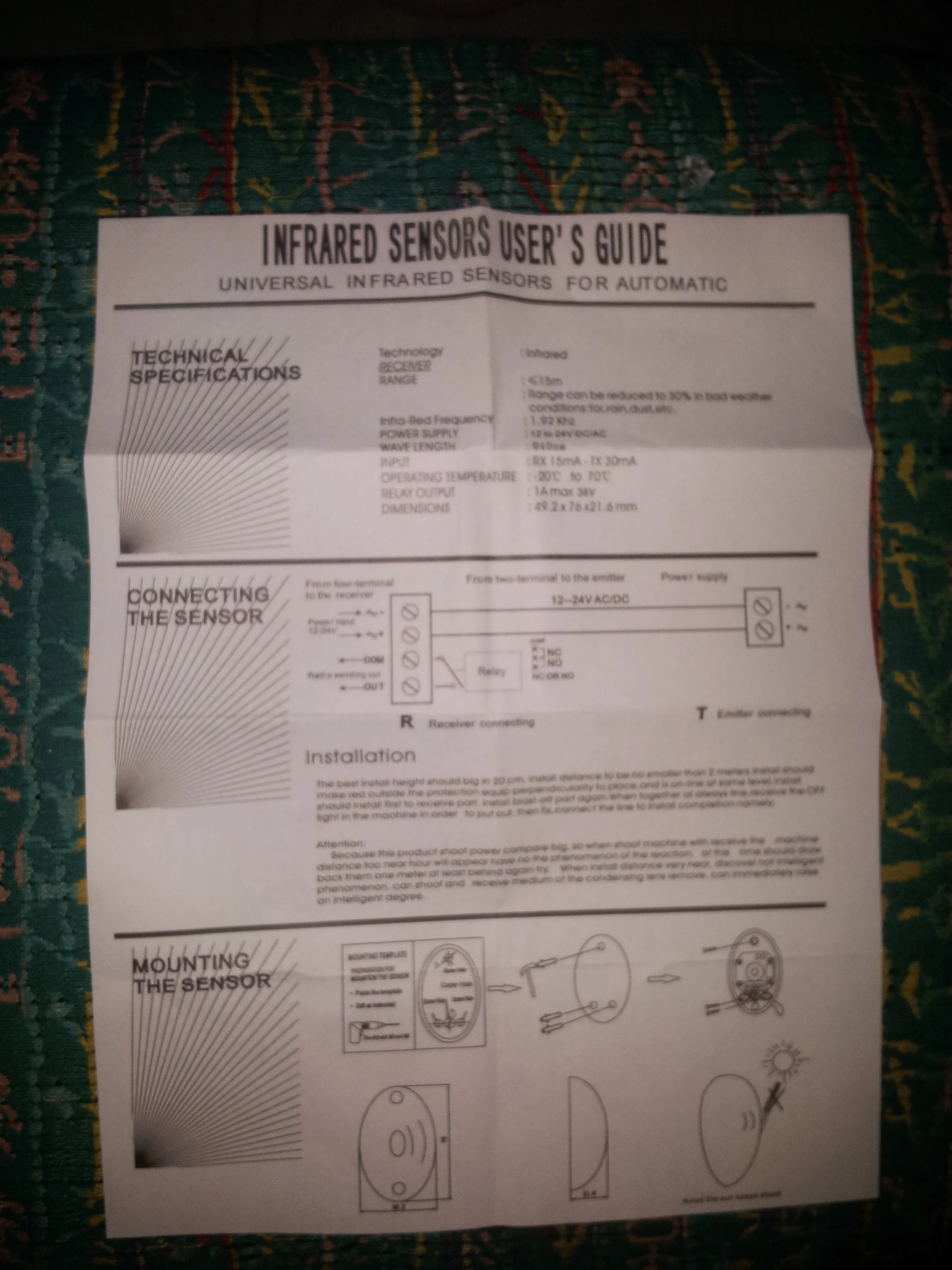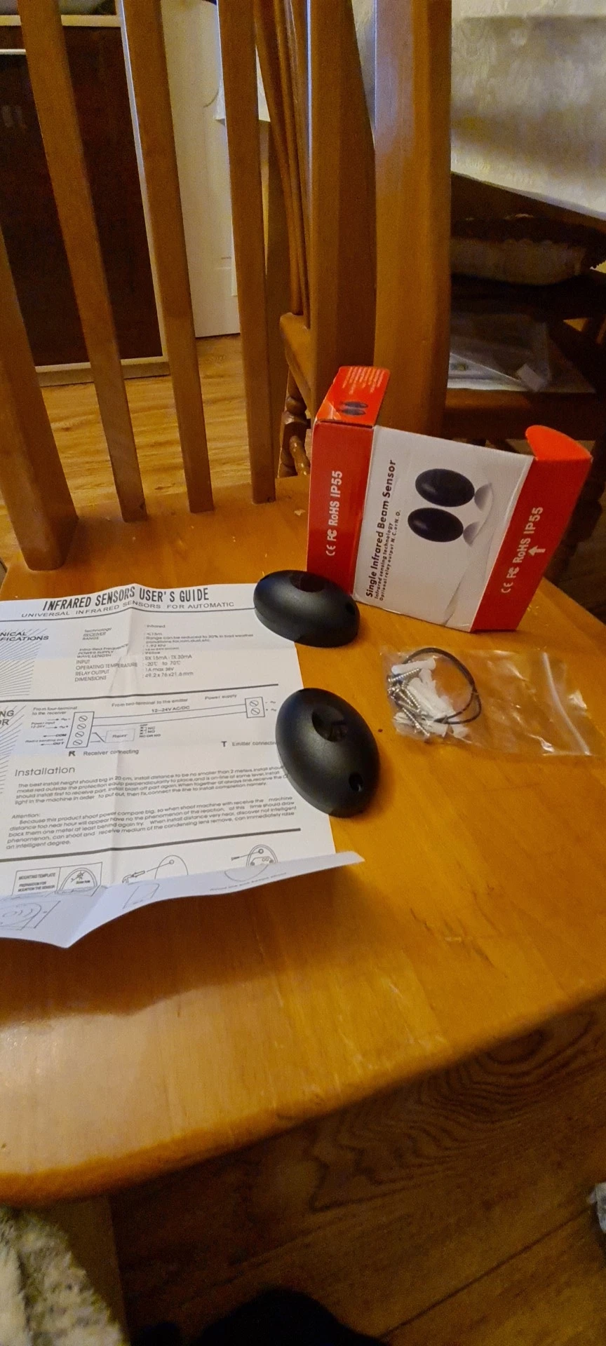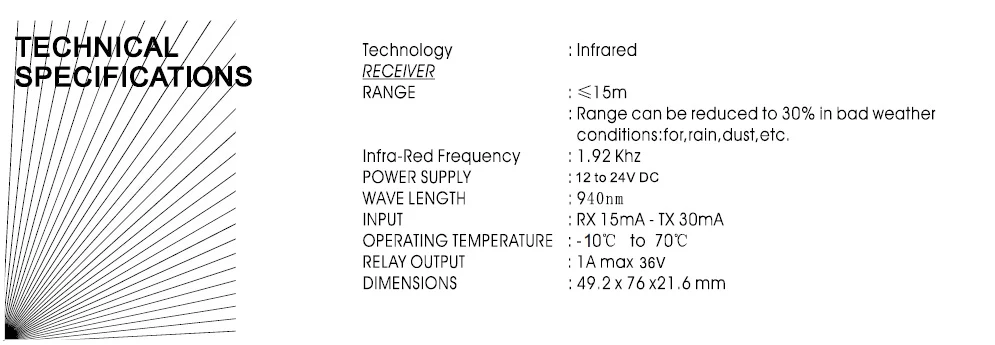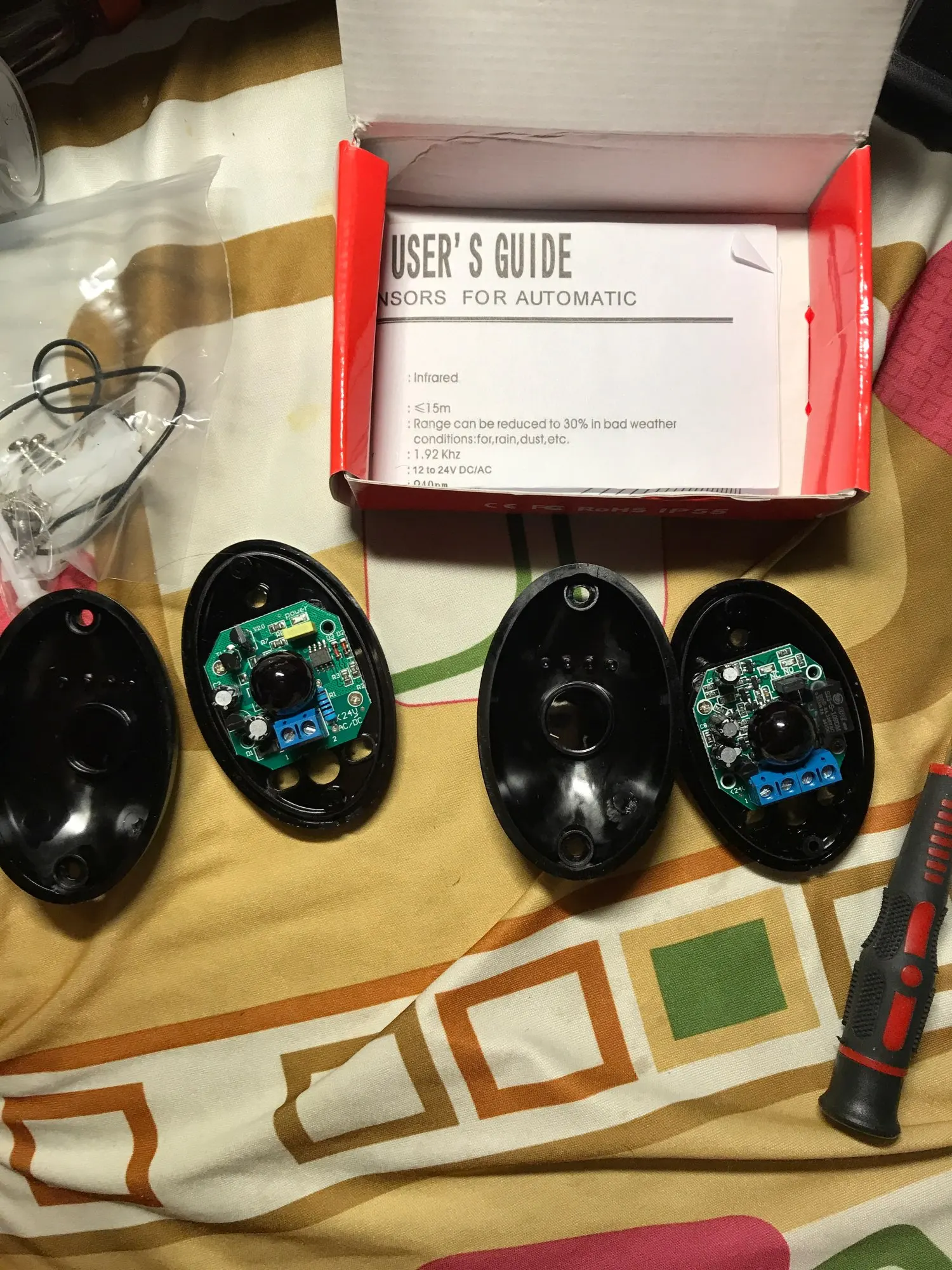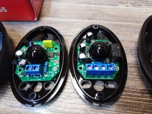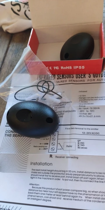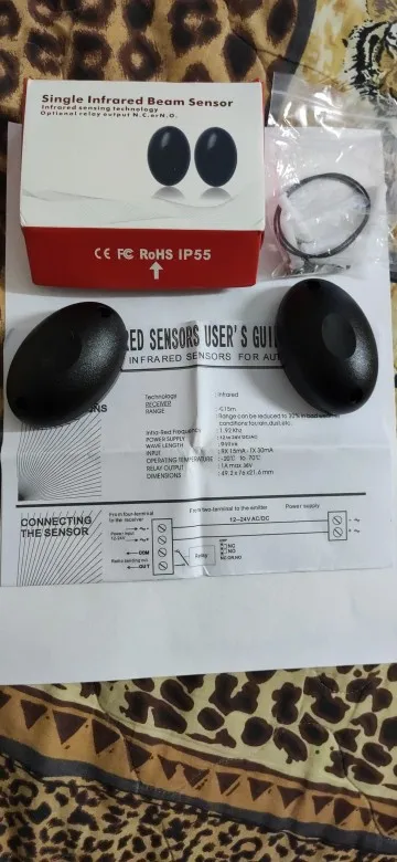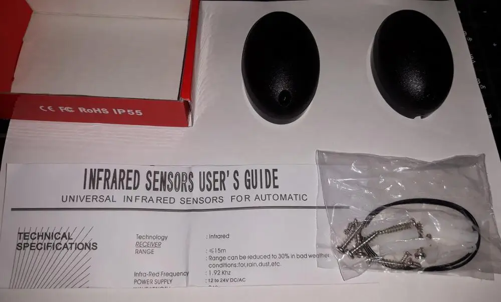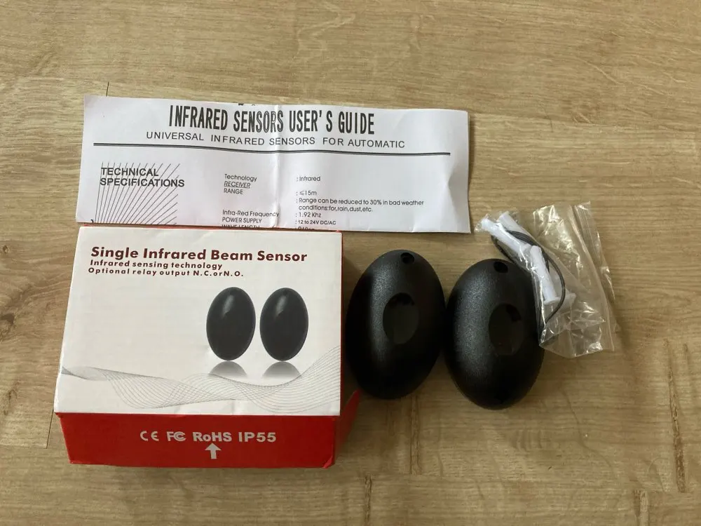 долго шло. датчики в коробочках. стандартные. для тех, кто ниразу не покупал: питание может быть и постоянное и переменное, 12-24 В, дальность до 15 м уверенно, выход нормально замкнутый и нормально разомкнутый. старайтесь ставить так, чтобы приемник не засвечивало солнце. срок службы, конечно, намного меньше, чем у came.