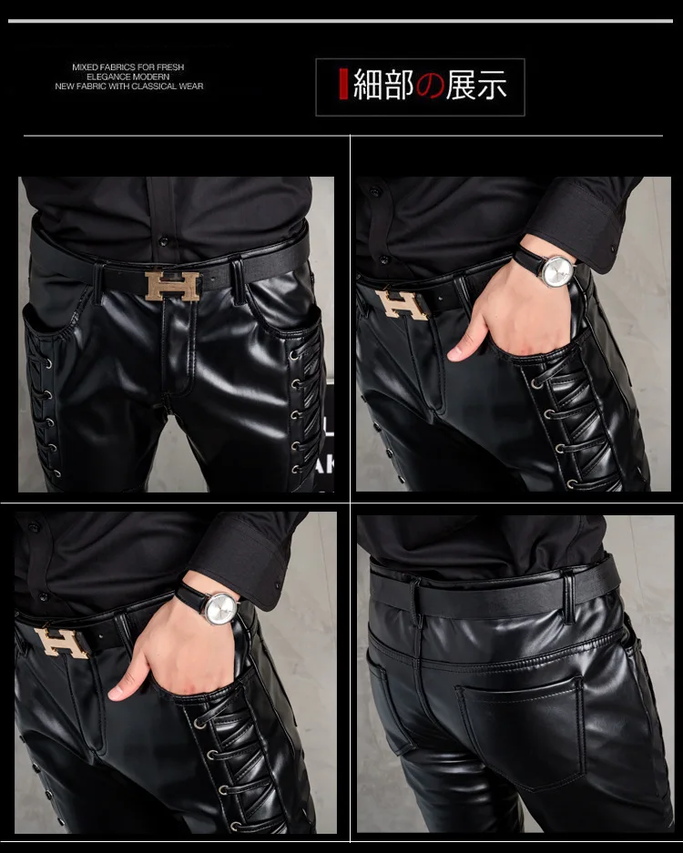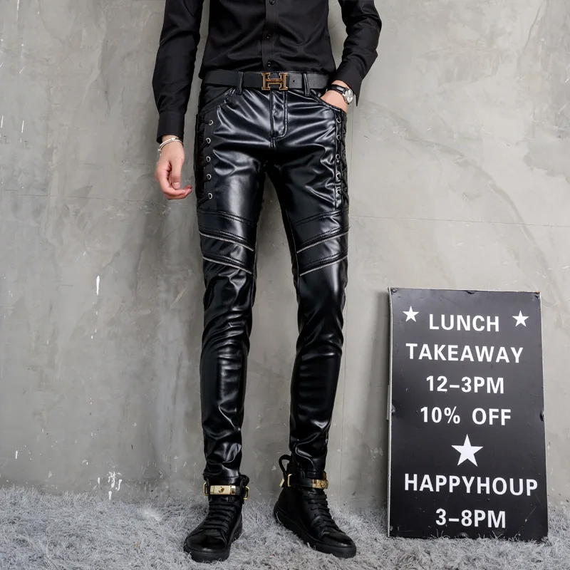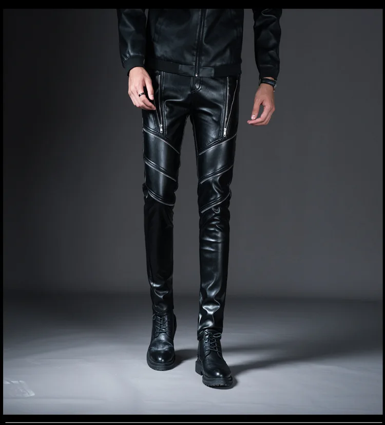 Брюки мужские кожаные облегающие, повседневные модные штаны из искусственной кожи, локомотивные брюки, одежда для выступлений в стиле панк-рок