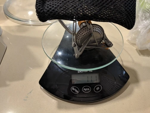 As described, weighs 101 grams exactly. The net pouch weighs 10 grams. Good adjustable flame, simmering on low flames works well. Construction seems stable.