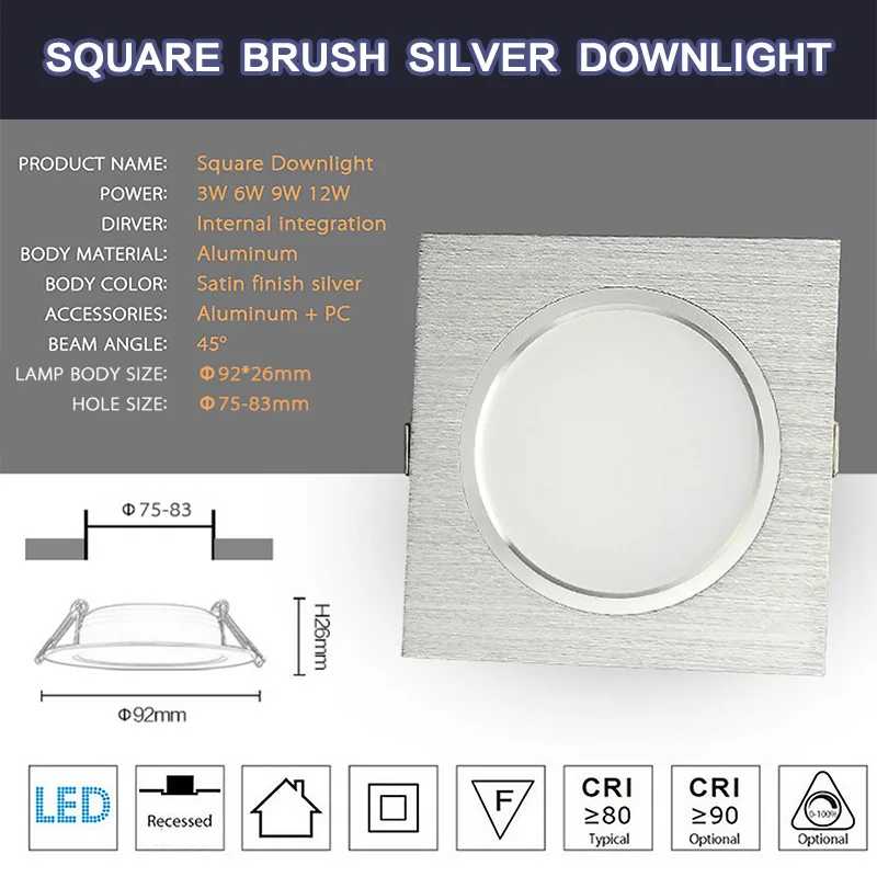 Светодиодные светильники квадратной формы, серебристые, 3 Вт, 6 Вт, 9 Вт, 12 Вт, AC220V, 230 В, светодиодные потолочные светильники для кухни/дома/офиса, внутреннего освещения----------------------------------------------------------------------------------------------------------------------------------------------------------------------------------------------