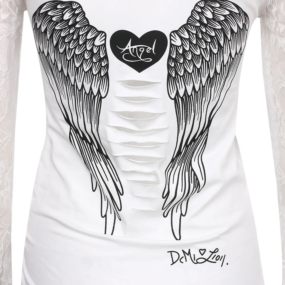 Женская футболка с вырезами на спине, Летние Стильные кружевные топы с длинным рукавом и крыльями ангела, футболки, одежда