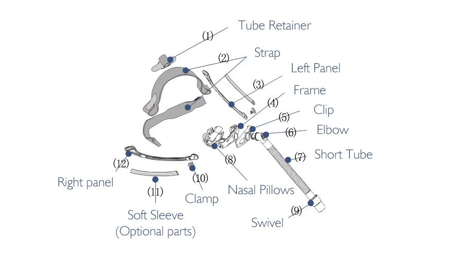 (1) Фиксатор трубки;(2) ремешок;(3) Левая панель;(4) рамка;(5) зажим;(6) Локоть;(7) короткая трубка;(8) НАЗАЛЬНЫЕ подушечки;(9) поворотный;(10) зажим;(11) Мягкий рукав;(12) правая панель.