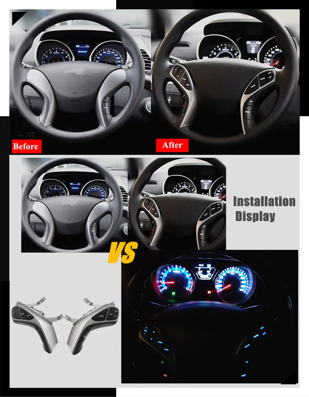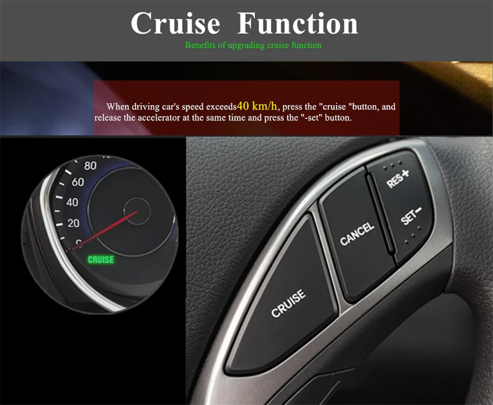 мой авто Елантра МД 2014мт рестайл . улитка была на 7пин....заказал с али улитку на 14пин (10контактов- сверху 5 и снизу 5)..поставил улитку и эти кнопки. проводку на 12 контактов(заказывал) . Итог ничего не работает . Необходимо - разъем проводки тот что втыкается в улитку перепиновать контакты, поменять местами верхние на низ, нижние на верх. Всё работает.. все кнопки, включая круиз, Кнопки светятся, но в моем случае не светится только одна кнопка кансл по другим отзывам с фото понял что это только у меня так. Не страшно. При включении круиза на панели отображается зеленым надпись круиз.