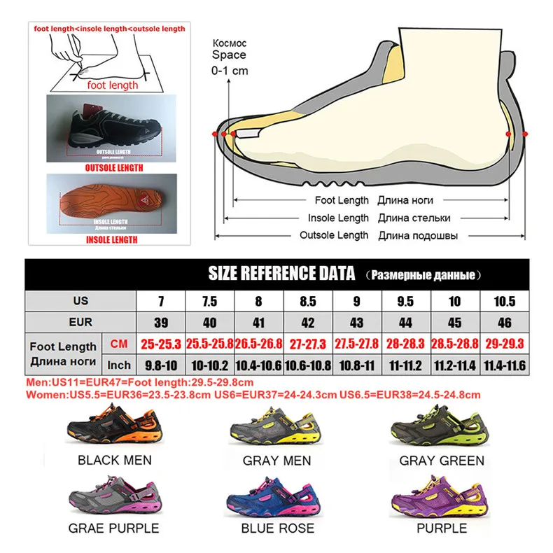 Всем привет купил сразу две пары, разные. закрытые - серого цвета, и открытые черные. размер 44, это для меня с небольшим запасом. т.е. для лета, я в 44 пальцами не задеваю обувь. много бегаю, много хожу. до 35тысяч шагов в день. в общем - 44 серые, отлично. как и должно быть. 44 черные, маленькие. реально они где-то 43 а по качеству - отлично все. и продавец за две пары, скинул рублей 500 или около того. PS я вытащил стельки, они по типу - одинаковые, т.е. пористая структура снизу, ткань сверху - одинаковые. поставил их рядом у стенки, и там где-то 5+мм они по длине отличаются PPS скрин с размерами сайта, и фото этикетки ботинок. у меня 275мм в носках. а у меня ноги упираются всеми пальцами, даже при полностью расшнурованном ботинке и ослабленной стропе пятки... в общем, маломерят знатно.
