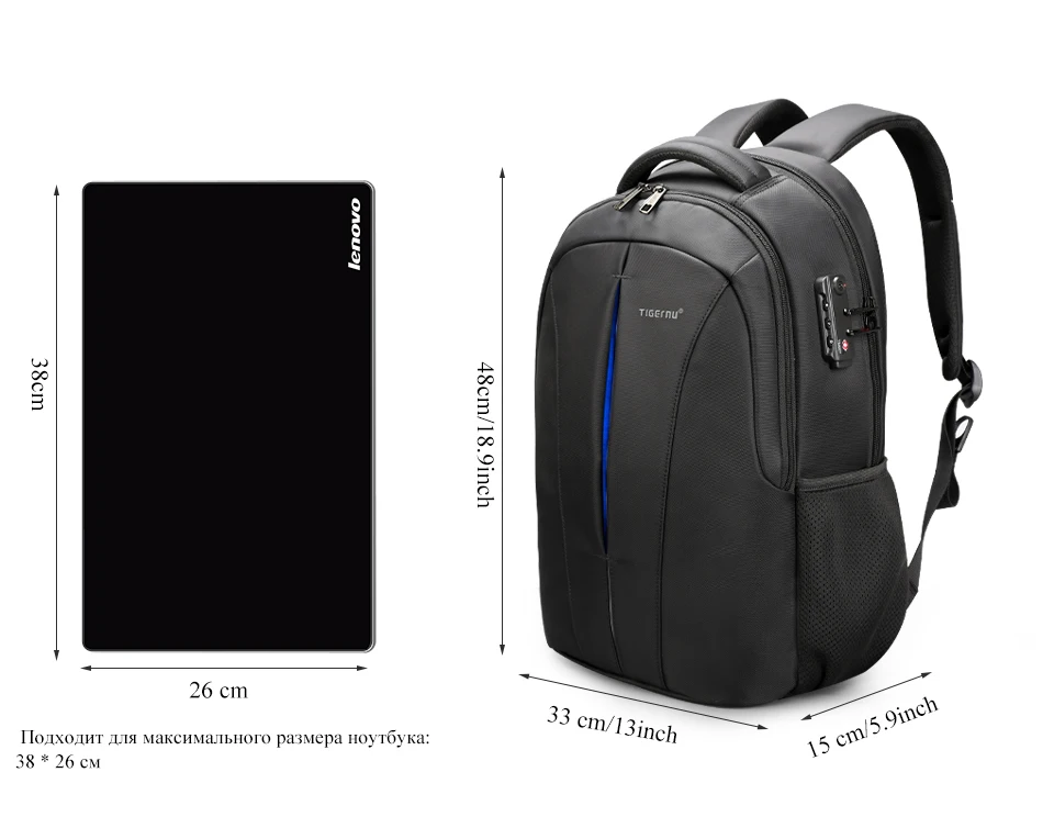 Товар прибыл примерно за неделю, в фирменной упаковке, основной отдел с двойной молнией, отдел поменьше с обычной молний, есть фиксатор нагрудный+ возможность его регулирования (верх,вниз и степень сжатия),также есть кодовый замок в комплекте, в рюкзак помещается спокойно ноутбук 15.6( я думаю 16.1 тоже сможет поместиться), несколько тетрадок толстых (3-4, на 96 стр .),обувь, 1.5 литровая бутылка, документы и в боковые карманы можно засунуть ещё мелочовку