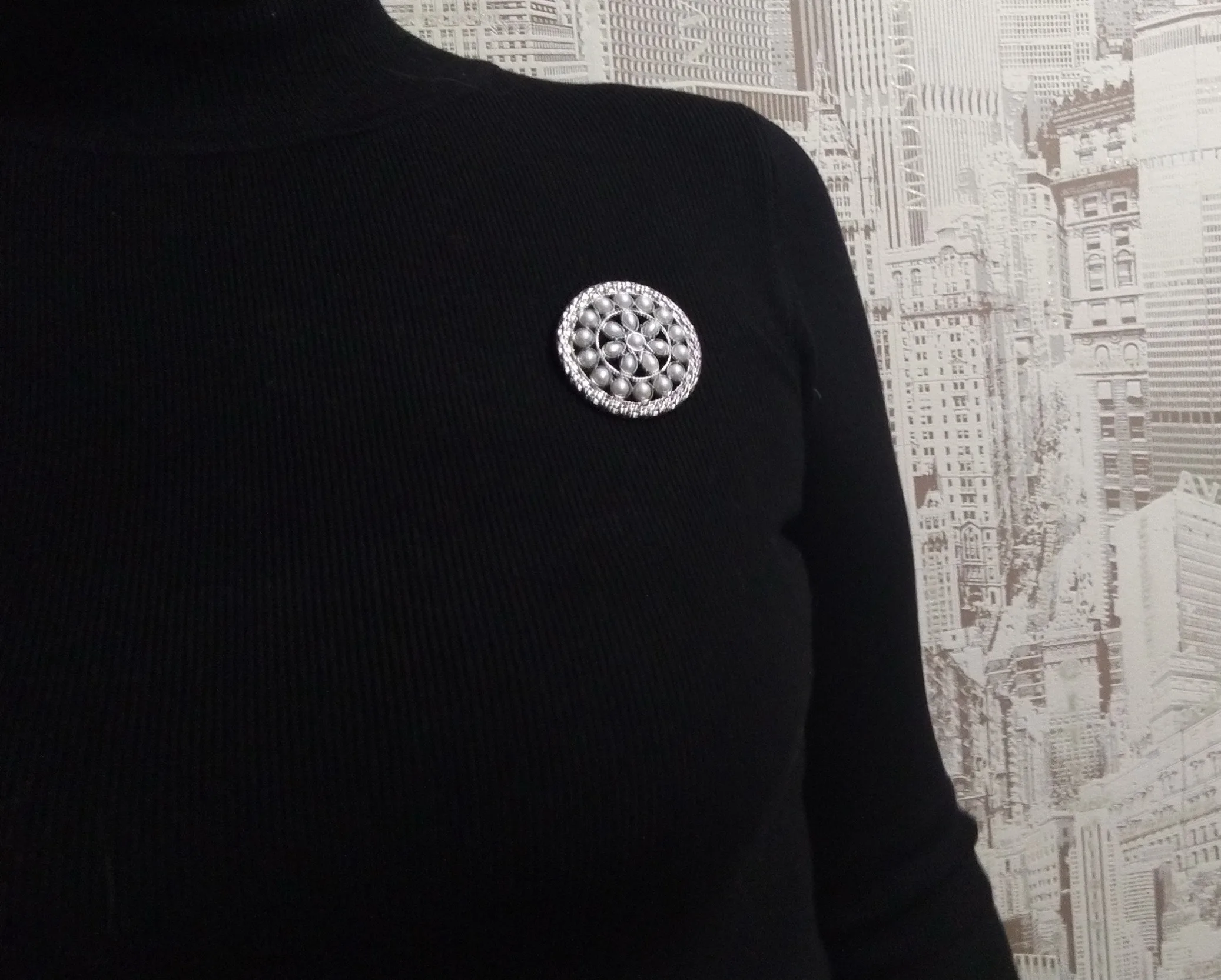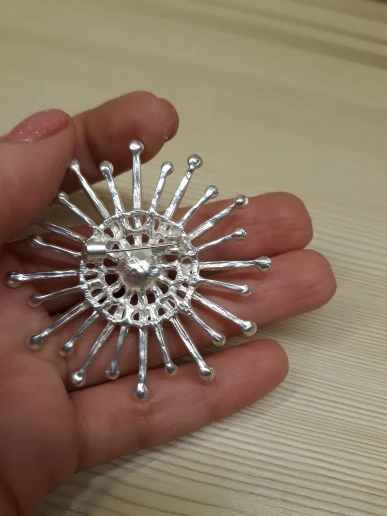 Брошь красивая, тяжёлая, на тонкой ткани отвисает. Хорошо смотрится на вязаной толстой ткани. Доставка быстрая. СПАСИБО!