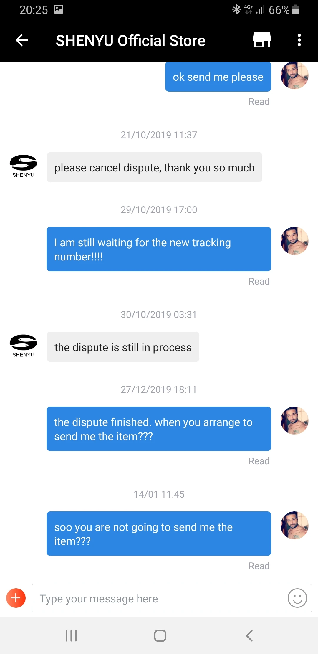 Самый плохой продавец когда-либо. Первый раз, когда я заказывал фонарик, товар никогда не пришел ко мне, поэтому я открываю спор. Он сказал мне отменить спор, и он отправит мне этот товар снова. Я отменил спор, и он не прислал мне товар. Как глуп я! После того, как я свяжусь с агентами ALIEXPRESS 3 раза по этому вопросу, они уверяют, что они хотят связаться с продавцом, чтобы отправить мне деньги обратно, этого никогда не было. Стыд на них!