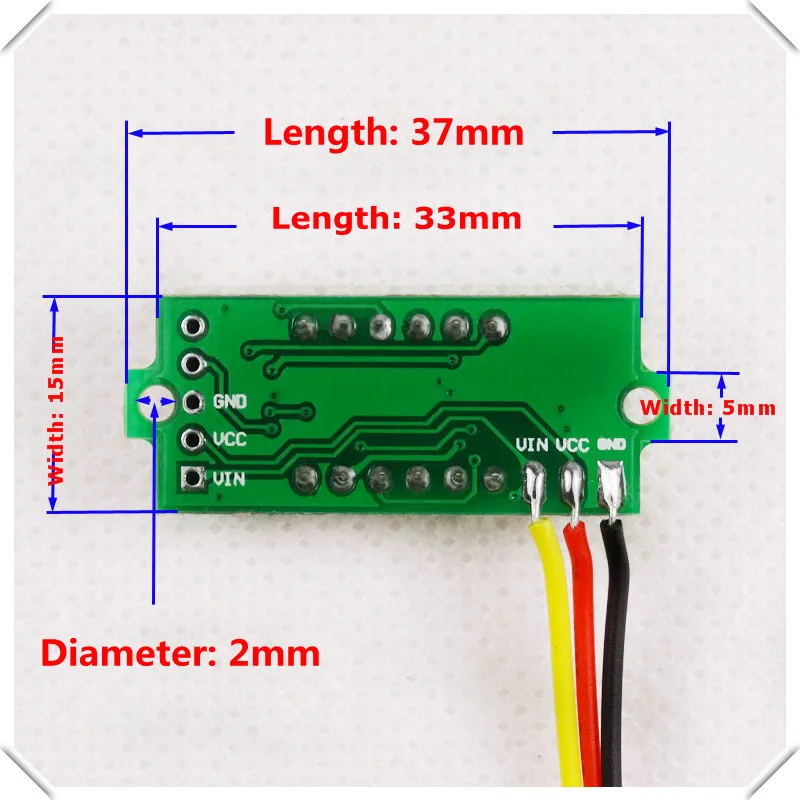 Вес: 7 г Дисплей цвет: Красный/зеленый/синий Дисплей режим: Четыре 0,36 светодиодный цифровой трубки Частота обновления: Около 500 мс/раз При снятии физических: 33x15x11 мм (Д * Ш * В) Вход диапазон : 4,5-30 в Мощность питания: Вы нуждаетесь в источника питания Длина подводящего провода: 9,5 см Диапазон измерений: Постоянный ток 0-33,00 в Управление температуры: -10 градусов ~ 65 градусов Точность измерения: ± (0.3%+ 2 разряда) Красная линия : Питание +(4,5-30V) Желтая линия: Измерьте Напряжение + Черная линия: Источник питания-, измерение напряжения-