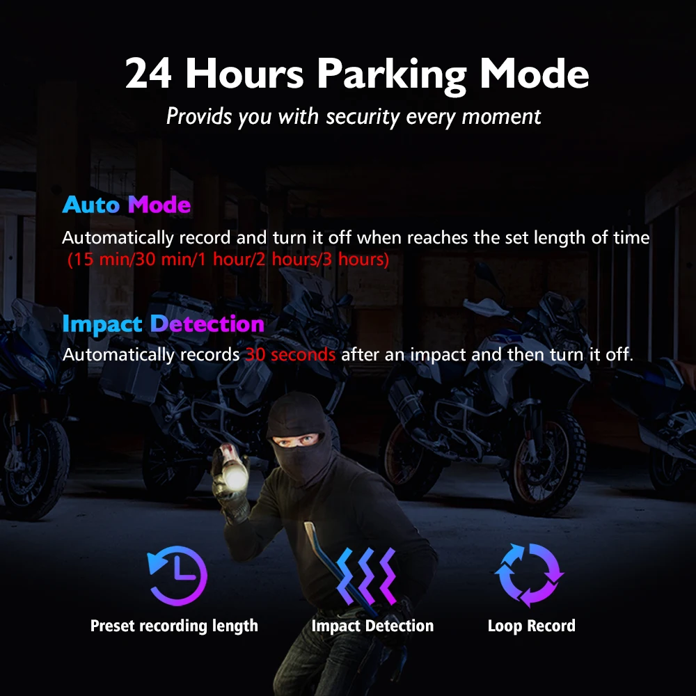 Видеорегистратор автоматически переключается в режим парковки, когда ваш велосипед припаркован и двигатель выключен, работает как система камеры наблюдения и автоматически записывает видео с заданной продолжительностью записи (автоматический режим) или при обнаружении каких-либо ударов или физического движения (обнаружение ударов ).● Автоматический режим: как передняя, так и задняя камеры будут автоматически записывать, когда двигатель выключен, а затем выключают его по истечении установленного времени (15 мин / 30 мин / 1 час / 2 часа / 3 часа).● Обнаружение удара: и передняя, и задняя камеры будут записывать 30 секунд после удара, а затем отключаются, чтобы снизить потребление энергии до минимума.