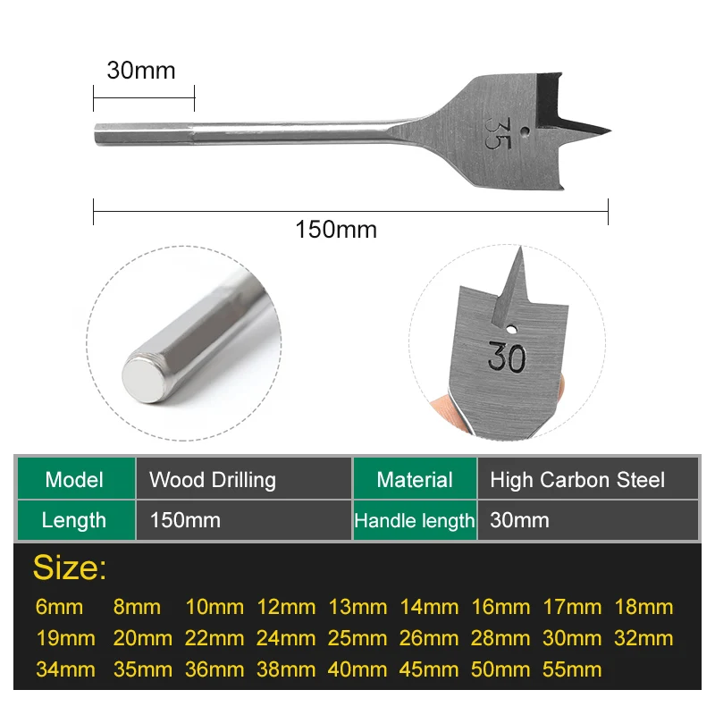 Набор Плоских Сверл из высокоуглеродистой стали и дерева, 6-55 мм