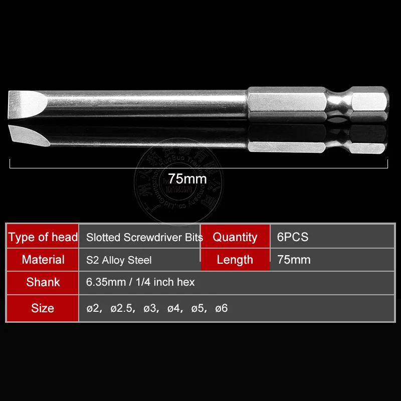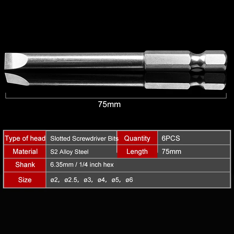 6 шт. 75 мм сверлильного станка шлицевая отвертка набор Биты отвертки набор импортированных Материал S2 Сталь щелевые насадки для душа ручной душ