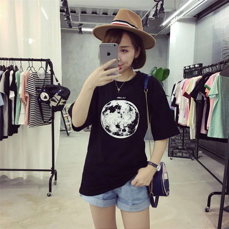 Jielur Шикарные летние новые индивидуальные планета Луна печатные свободные футболки для женщин тонкий с коротким рукавом для отдыха белая футболка топ женский m-xxl