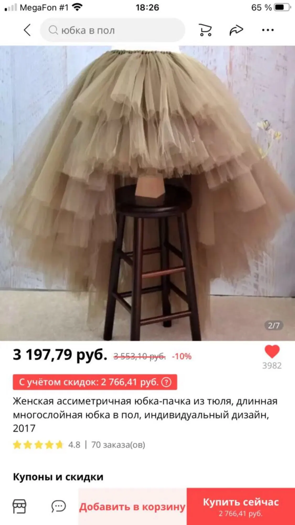 Я была очень расстроена заказом. Заказала юбку на день рождение. Надеялась, что она будет бежевой, как на фото продавца. Сначала продавец неделю не отправлял юбку, я решила отменить заказ, так как думала, что юбка уже не успеет придти к назначенной дате, но продавец обратно вернул заказ и отправил юбку. Я очень обрадовалась, когда она пришла очень быстро, но когда я получила ее то была Мега расстроена! Юбка пришла белого цвета!!! Это была просто свадебная юбка, которую никуда не наденешь. Качеством юбка хорошая, но никуда не пригодная, выкинутые деньги и плюс пришлось быстро искать новый наряд на вечеринку. Открыла спор, продавец хотел вернуть половину стоимости, но алиэкспресс был на моей стороне и вернули полную сумму. Поэтому ставлю продавцу четверку. Юбка правда классная, но о цвете договаривайтесь сразу с продавцом. А я попробую ещё раз заказать через год))