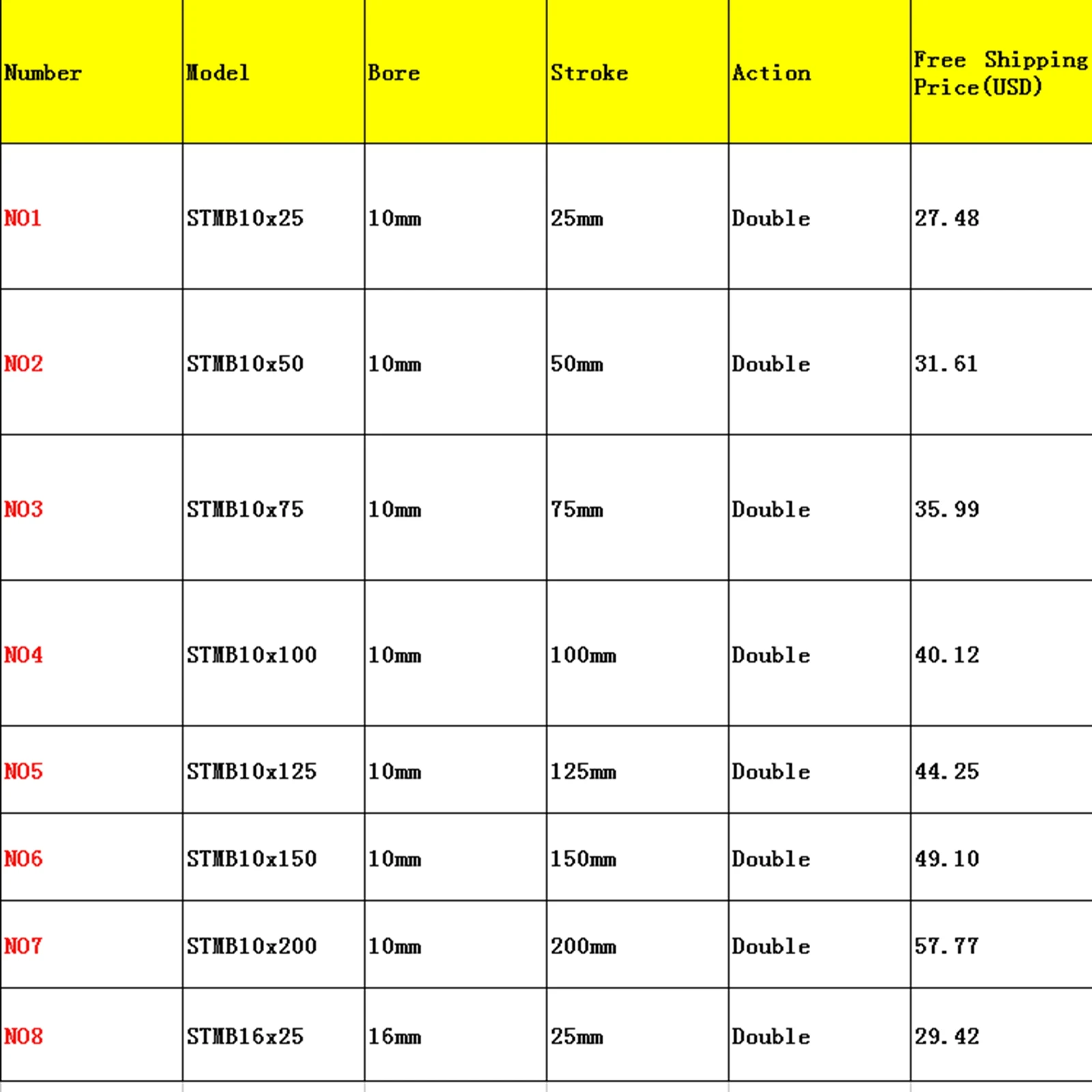 Мы не можем загрузить все ссылки из-за слишком большого количества спецификаций продукта, поэтому только через номер формы, чтобы заменить их, пожалуйста, обратитесь к форме, когда вы выбираете необходимые спецификации. Если у вас есть какие-либо вопросы, пожалуйста, свяжитесь с намиТовар: цилиндр с двумя стержнями STMB диаметр 10-16 мм ход 25-200 мм Воздушный скользящий стол цилиндр с магнитом см. Форму в описанииДиаметр отверстия: 10 мм 16 ммХод: 25 мм 50 мм 75 мм 100 мм 125 мм 150 мм 200 ммМатериал: алюминиевый сплавТип действия: двойной действующий стержень: двойной стерженьЖидкость: воздух (фильтруется фильтром 40 мкм)Гарантированное сопротивление давлению: 13.5 кг/см2Диапазон рабочего напряжения: 1.0MPa(10.5kgf/cm2)Температура:-5 ~ + 70CДиапазон скорости: 50 ~ 200 мм/сек.Тип буфера: нетПорты и разъёмы Размер: M5x0.8STMB все с магнитомПримечания: Это BSP и метрическая резьба не NPTВнимание: если вам нужны другие типы цилиндров, пожалуйста, свяжитесь с нами, и мы предложим вам больше вариантов.