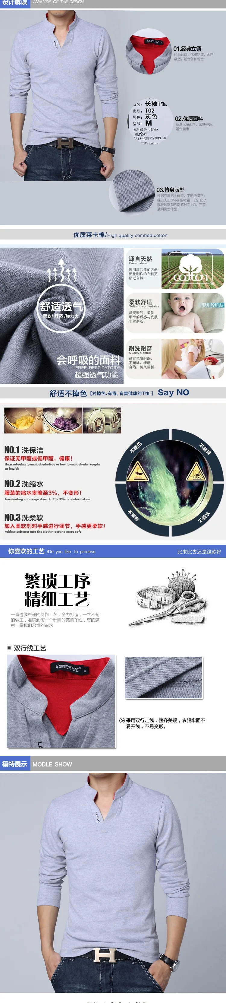 Мужская хлопковая футболка с длинным рукавом, с воротником-стойкой