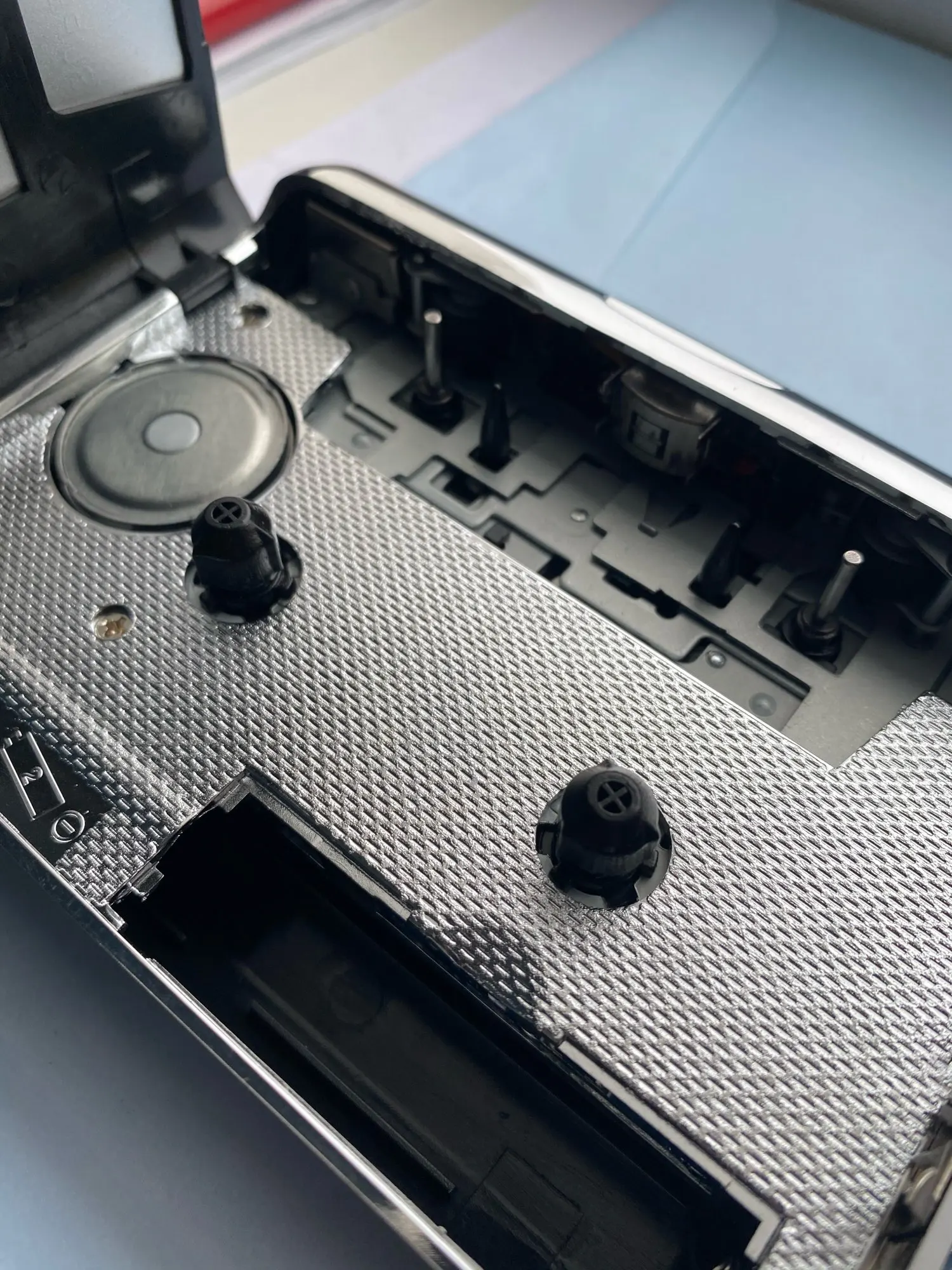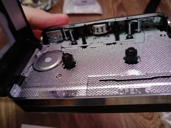 Посылка с плеером добралась до Северного Урала быстро, за две недели. Конструкция плеера интересная, кнопка пуск соединёна жёстко с магнитной головкой и прижимными роликами. Хорошего качества воспроизведения ждать не стоит, в общем занятная игрушка.