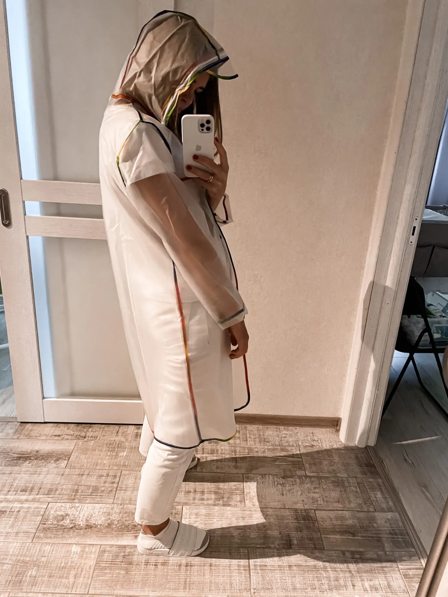 Он подходит просто идеально, и я искала длинный дождевик, и тот, который опускается ниже колен, я купила XL, и я на 1,69 выше. Идеально! Ткань на ощупь очень хорошая, очень мягкая.