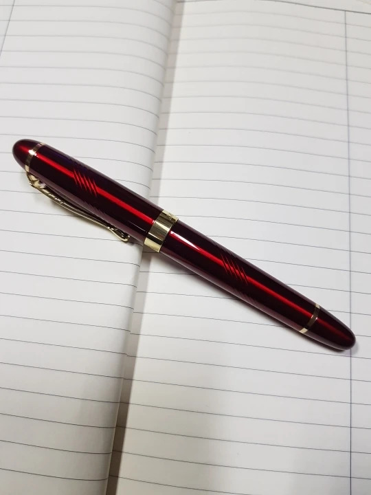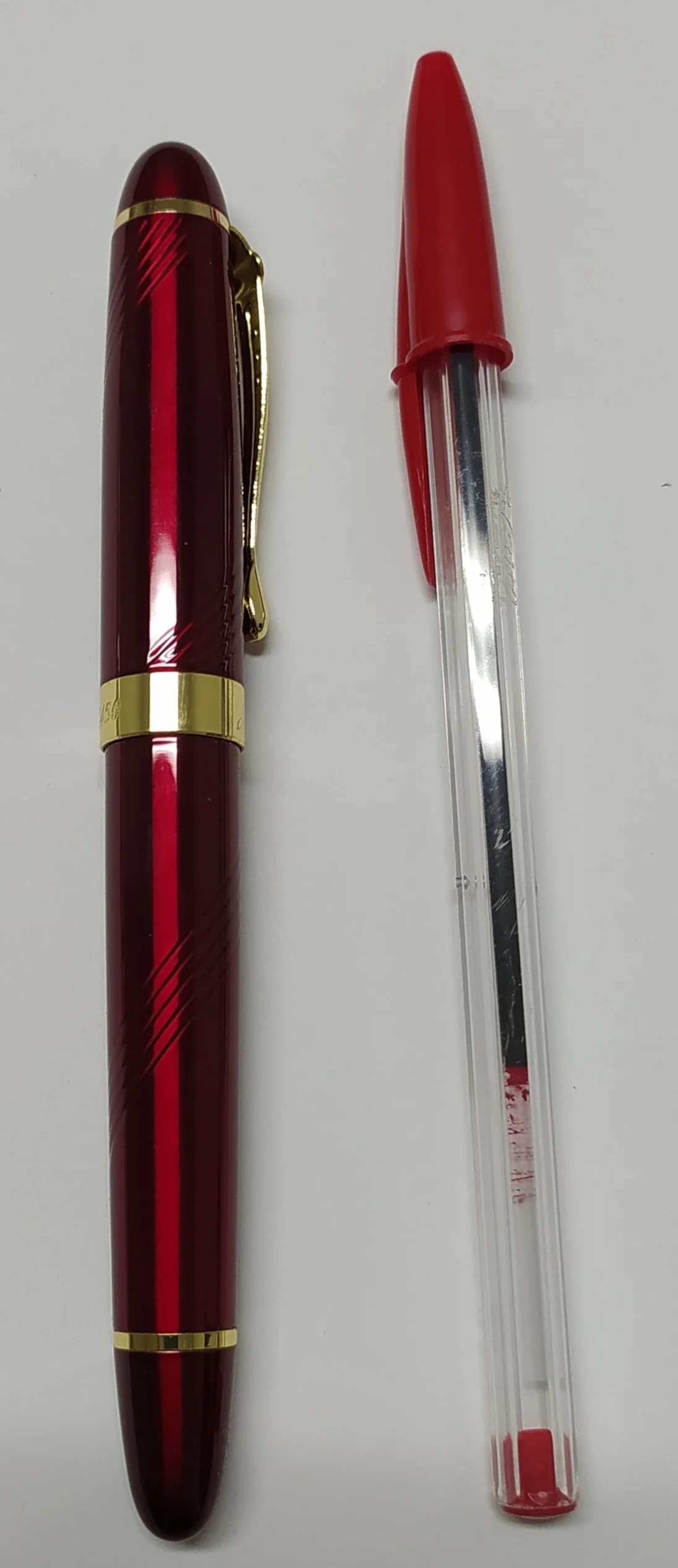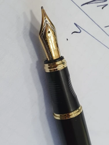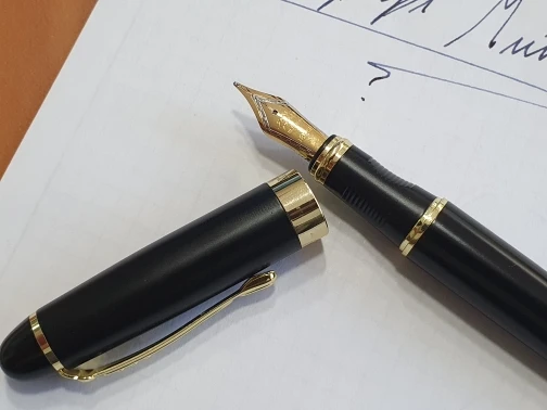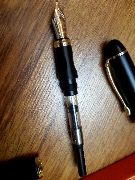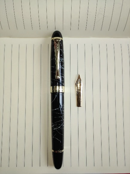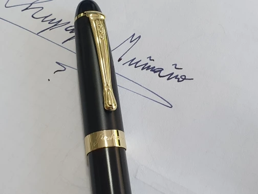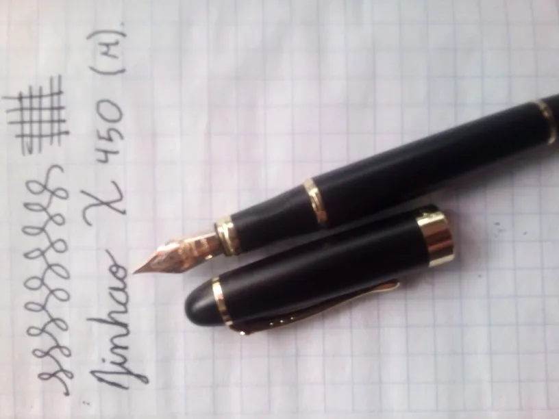 Ручка очень понравилась. Я даже закрыл глаза на то, что продавец, возможно, забыл укомплектовать пером 0.5мм как в заказе, по скольку начертания были толстыми. После 15-ти минутной доработки кончика пера, она стала писать тоненько, как я и хотел. Ручка большая, увесистая, удобная, приятно держать в руке. Заправлять можно непосредственно чернилами, или использовать сменные картриджи (диаметр внутреннего отверстия 2,5мм). Надпись в блокноте сделана уже дороботанным пером. Справа, для сравнения, моя старая перьевая ручка, тоже китайского бренда. Это конечно на любителя, но перьевой ручкой писать одно удовольствие, не сравнить с шариковой. Доставка стандартная — в районе трёх недель до Черкасс. Продавца могу рекомендовать.