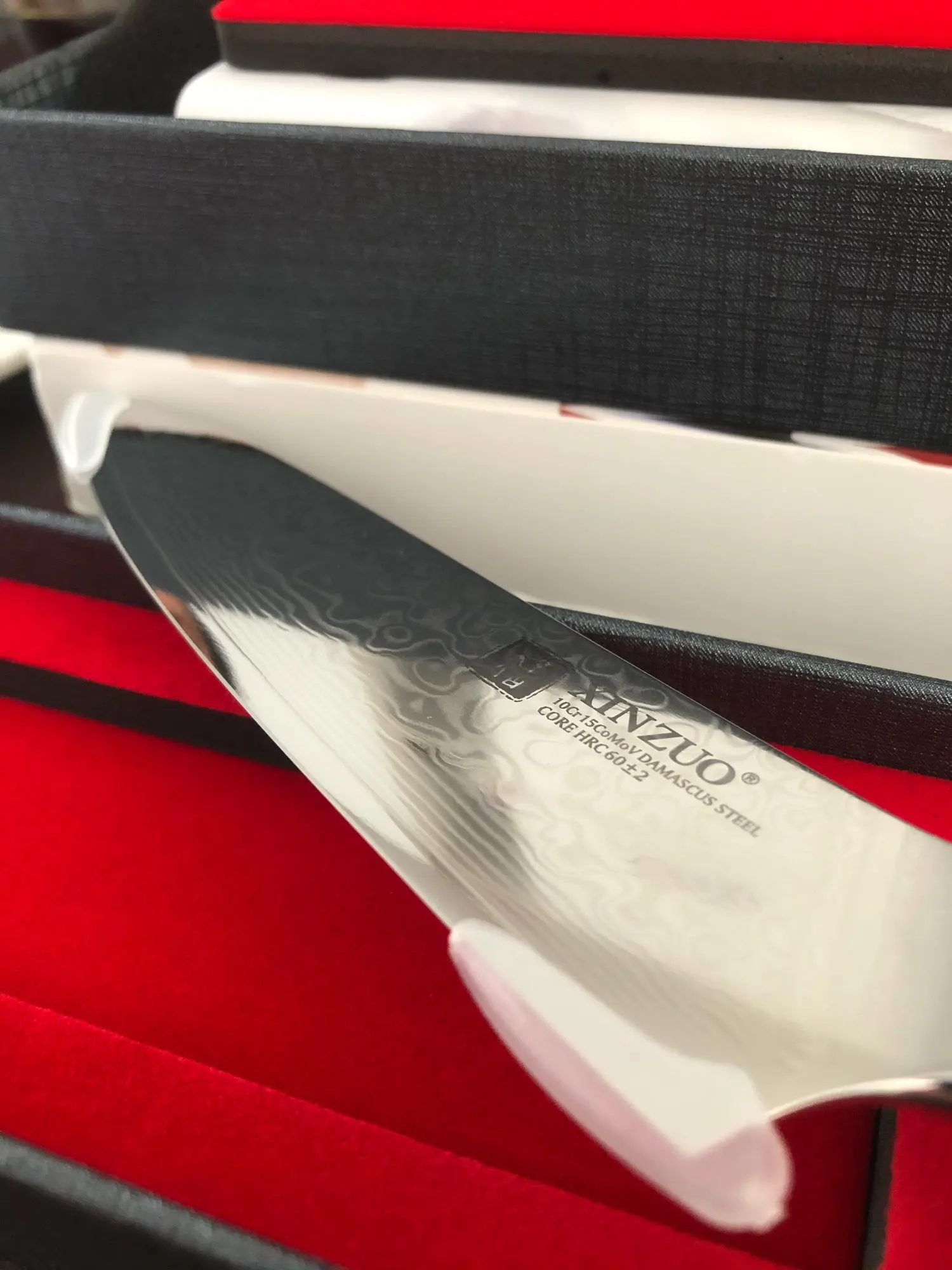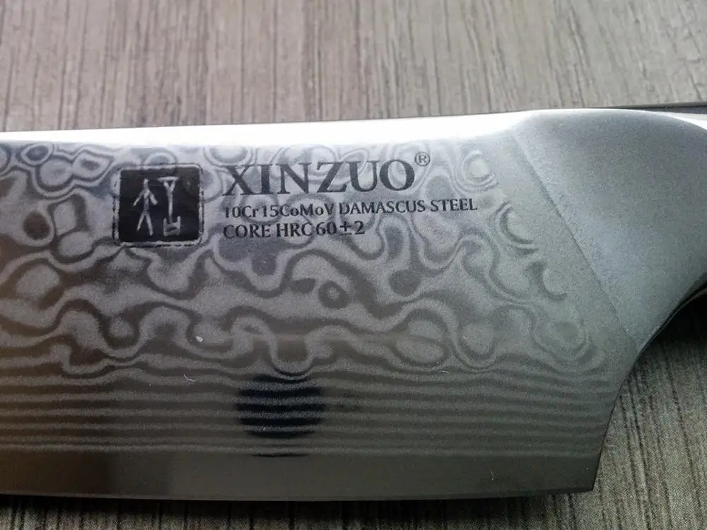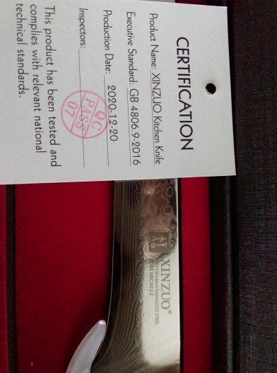 RU:Доставка 18 дней, очень быстро даже без оглядки на пандемию. Упаковано только в пупырчатый пакет, но коробка довольно плотная, дошла без повреждений. Изготовлен тщательно, довольно массивный, очень острый. Но думаю, что это не дамаск, а гравировка. В приложенном "сертификате" всего лишь указано соответствие стандарту GB 4806.9-2016. Твёрдость указана лишь на самом лезвии, но в виде 60±2, и если 62 - это хорошо, то 58 - посредственно. После трёх недель обычного домашнего использования в качестве основного ножа он всё ещё острый, точить пока не понадобилось. EN:Delivered in 18 days, very quickly even without considering the pandemic. Packaged just in a bubble envelope, but the box is solid enough and arrived undamaged. The knife is manufactured well, solid and very sharp. However, I think it's engraving. The included "certification" just states the compliance with the GB 4806.9-2016 standard. The hardness is specified on the blade only as 60±2, and if 62 is decent, 58 is average.