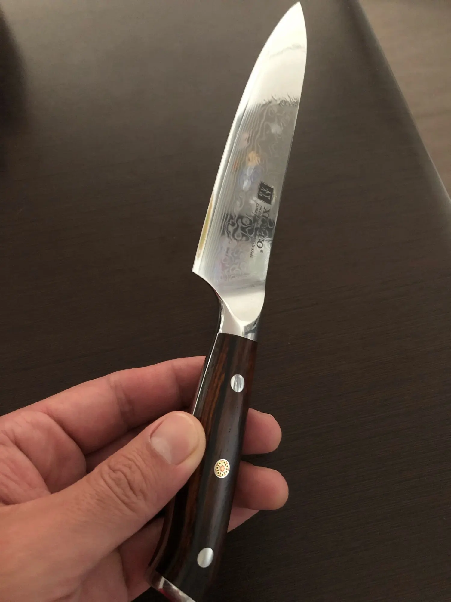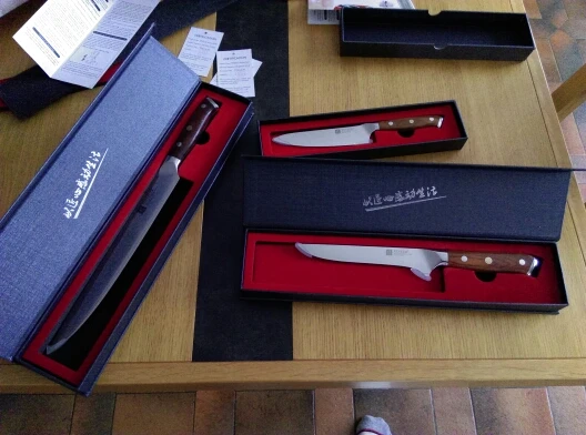 Нож пришел очень быстро. Упаковка очень качественная (фирменная коробка), соответствует высокой стоимости изделия. Внешне все выглядит очень качественно (материал клинка и ручка), нож очень острый, размер, на мой взгляд, оптимальный для использования на домашней кухне (такие в магазинах называются универсальными), остальное покажет время.