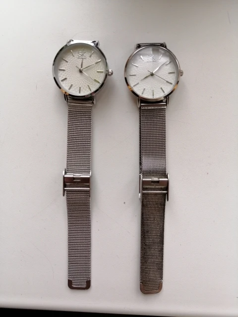 Часы классные, доставка быстрая. Но 2 года назад качество было лучше. Заказывала у этого же продавца такие часы в 2018 г, спустя больше 2 лет села батарейка и браслет немного потемнел и я решила заказать новые. Циферблат у новых темнее, и они легче, как игрушечные, раньше такие добротные были. На фото слева новые, справа старые часы.