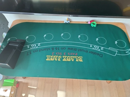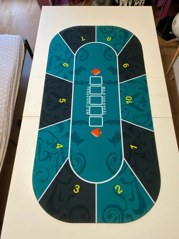 хорошее по качеству сукно. из недостатков - маленькие по размеру "окошки" для карт, существенно меньше обычного. был запах резины, потом выветрился. В целом ок, но для большого количества человек лучше брать большего размера.