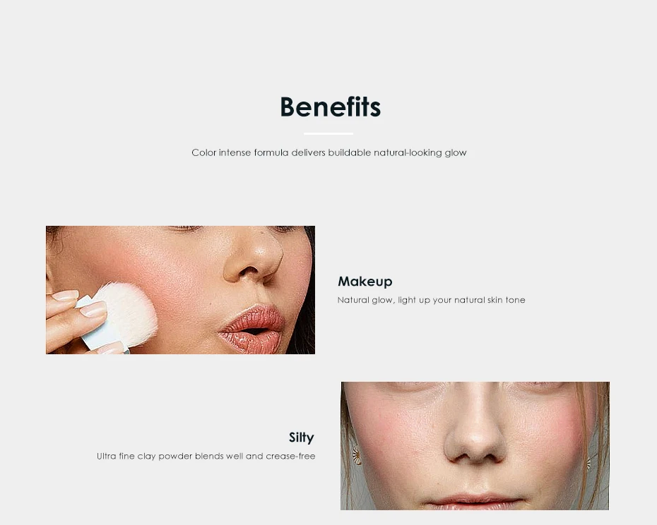 Как использовать:Нанесите кистью цвет и слегка удалите излишки пудры. Слегка наносите на щеки, лоб, подбородок и/или нос и хорошо смешивайте для мягкого сияния.Детали:Вес нетто: 6 гПосылка d в одной посылка вкеЛицензия на здоровье: GD.FDA29-XK-3276Лицензия на производство: XK16-108 8553Исполнительный стандарт: QB/T1976-2004