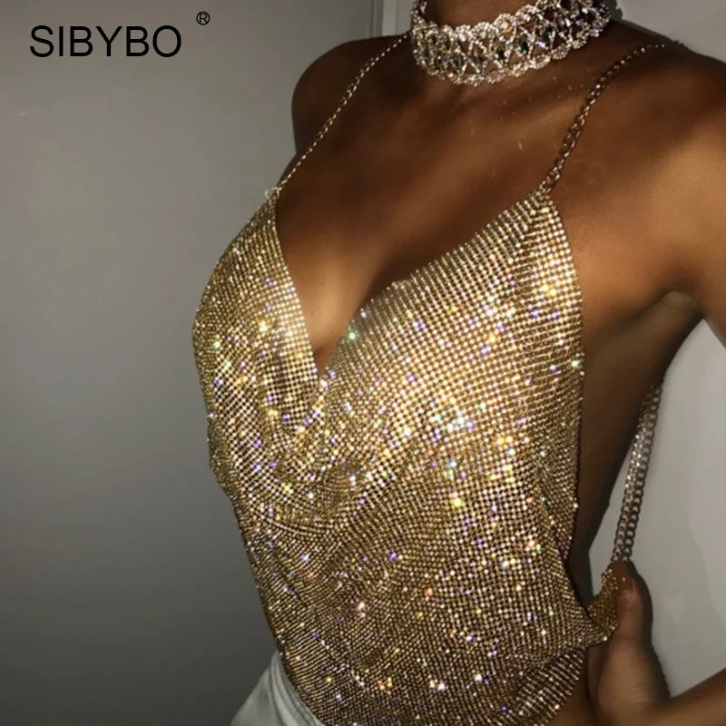 Женский Блестящий укороченный топ Sibybo, укороченный топ с открытой спиной и лямкой через шею, укороченный пляжный топ ручной работы для вечеринки на лето