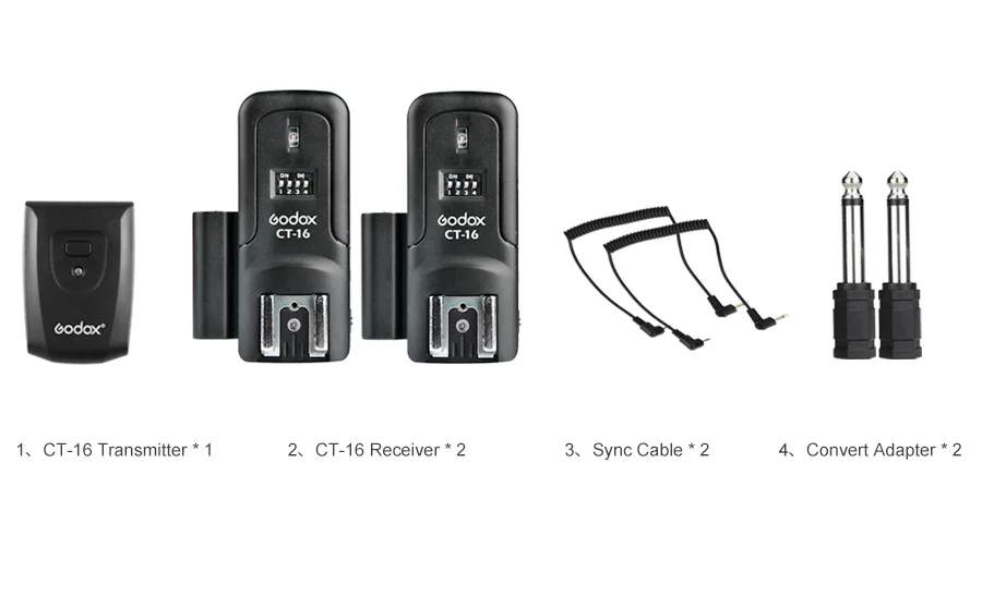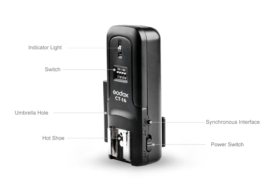 Триггер приемника принимает сухую батарею для источника питания, которая является безопасной, энергосберегающей и удобной. Продукт принимает микрокомпьютер для управления декодированием, который имеет превосходную способность анти-помех; Чувствительная скорость реакции, самая высокая Синхронная скорость может достигать 1/250 сек.