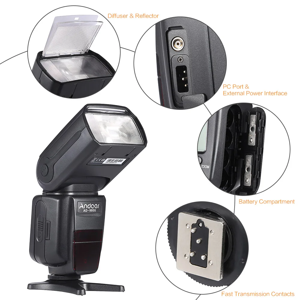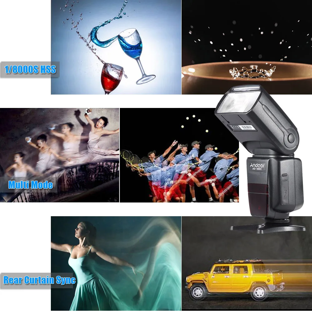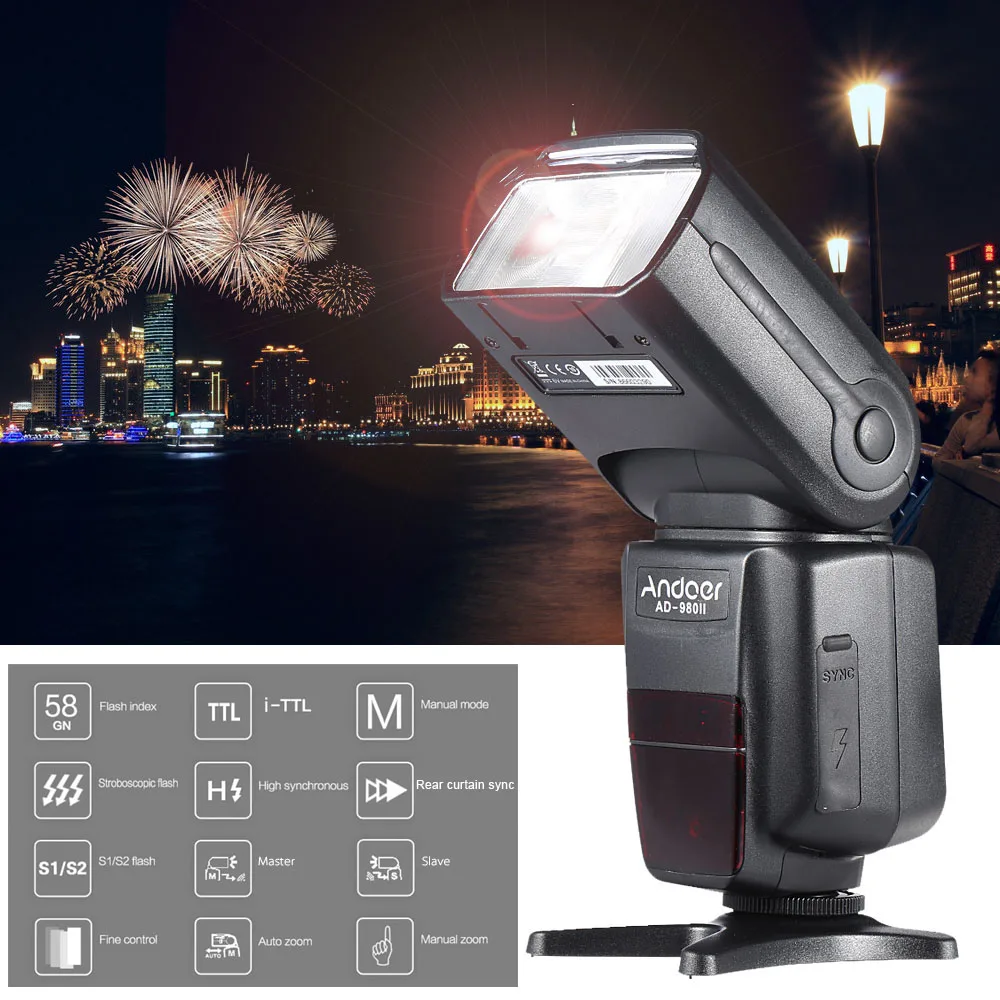С большим количеством направляющих GN58, Andoer AD-980II действительно хорошо работает. Высокая Скорость синхронизации до 1/8000 с, достаточно, чтобы запечатлеть удивительный момент. Его также можно использовать в качестве главного или подчиненного блока, Особенности:Предназначен для цифровых зеркальных камер Nikon, таких как Nikon D7200 D7100 D7000 D5200 D5100 D5000 D3000 D3100 D3200 D3300 и т. Д.Несколько режимов съемки: i-TTL/M/Multi/Slave C/Slave N/S1/S2 режимы.Мощная Вспышка с большим количеством направляющих GN58. (ISO 100, 180 мм).Может использоваться в качестве главного или подчиненного блока.Поддерживает высокоскоростную синхронизацию до 1/8000 с, достаточно, чтобы запечатлеть удивительный момент.Быстрое время переработки до 2,9 с.Поддержка автоматического/ручного масштабирования, охватывает фокусное расстояние от 18 мм до 180 мм.Поддержка звуковых подсказок, синхронизация задних штор, режим энергосбережения, защита от перегрева и т. д.Поддержка 4 каналов в 3 группах.1/128-1/1 выходной контроль, 22 уровня тонкой настройкиПоддержка высокой скорости непрерывной съемки: в 1/16 яркости или ниже, он может поддерживать 12 снимков в секунду. Характеристики:Конструкция цепи: IGBTНомер направляющей: GN58 (ISO 100, 180 мм)Покрытие вспышки: ручная/автоматическая 18-180 мм (18 мм, 24 мм, 28 мм, 35 мм, 50 мм, 70 мм, 85 мм, 105 мм, 135 мм, 180 мм)Режим вспышки: i-TTL/M/Multi/Slave C/Slave N/S1/S2Вертикальный угол поворота:-7-90 градусовУгол горизонтального вращения: 0-360 градусовДальность передачи: в помещении 20-30 м/на открытом воздухе 10-15 мВремя вспышки: 1/200s-1/20000 sУправление вспышкой: 1/128-1/1 выходное управление, 22 уровня тонкой настройкиВнешний интерфейс: горячий башмак/порт ПК/Внешний порт питанияВремя рециркуляции: до 2,9 сПитание батареи: 4 * AA (не входит в комплект)Время освещения: 100-1500 разДополнительные функции: Звуковая подсказка, синхронизация задних штор, энергосберегающий режим, защита от перегрева и т. Д.Размер изделия: 19,5*7,7*5 см/7,7*3,0 * 2.0inВес изделия: 404 г/14,3 унцийРазмер упаковки: 22,5*10*8 см/8,6*3,9*3,1 дюймаВес упаковки: 592 г/20,9 унций Примечание:Аккумулятор в комплект не входит.Вы не можете напрямую установить высокоскоростную синхронизацию и синхронизацию задней панели на speedlite, вам нужно настроить меню камеры на «FP» автоматически открывается, И нет дисплея (Высокоскоростная синхронизация и синхронизация задней панели) на speedlte. Комплектация:1 * Speedlite1 * Мини-пластина1 * чехол для переноски1 * Диффузор1 * Руководство пользователя (на английском языке)