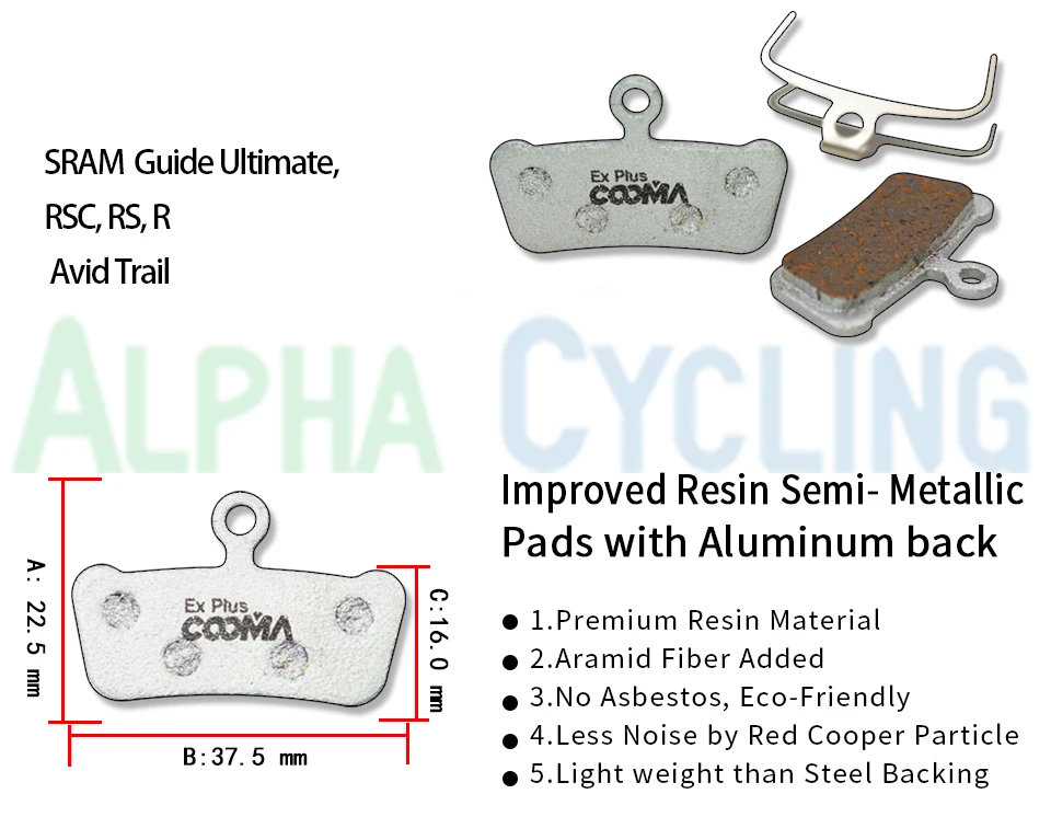 4 пары для 4 суппортовЛегкая алюминиевая подложка и высокопроизводительное полуметаллическое соединение уменьшают вес почти на 50%, идеально подходят для езды по пересеченной местности.Для: AVID SRAM Trail/GUIDE/G2Материал: подложка из алюминиевого сплава + Смола EX Plus