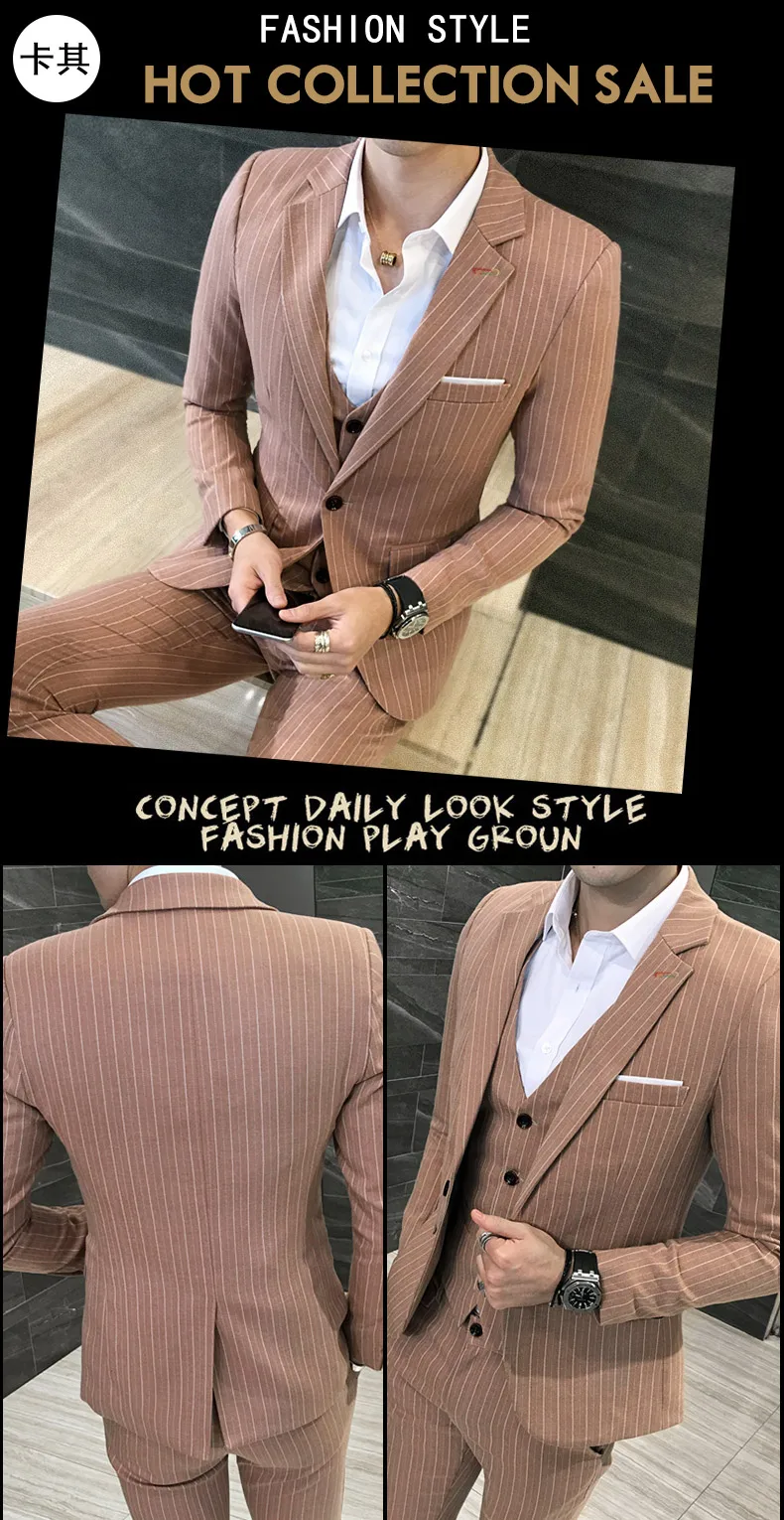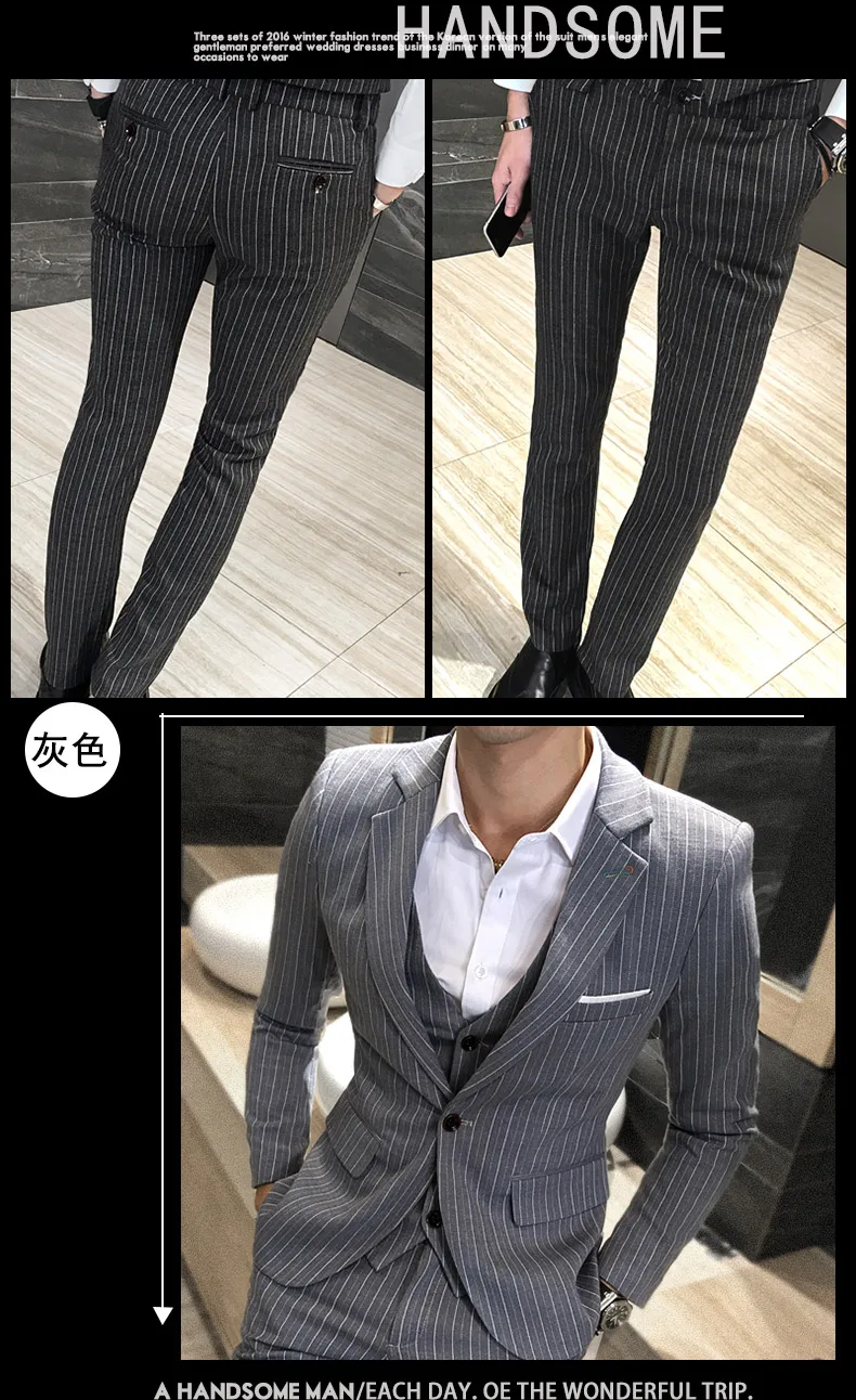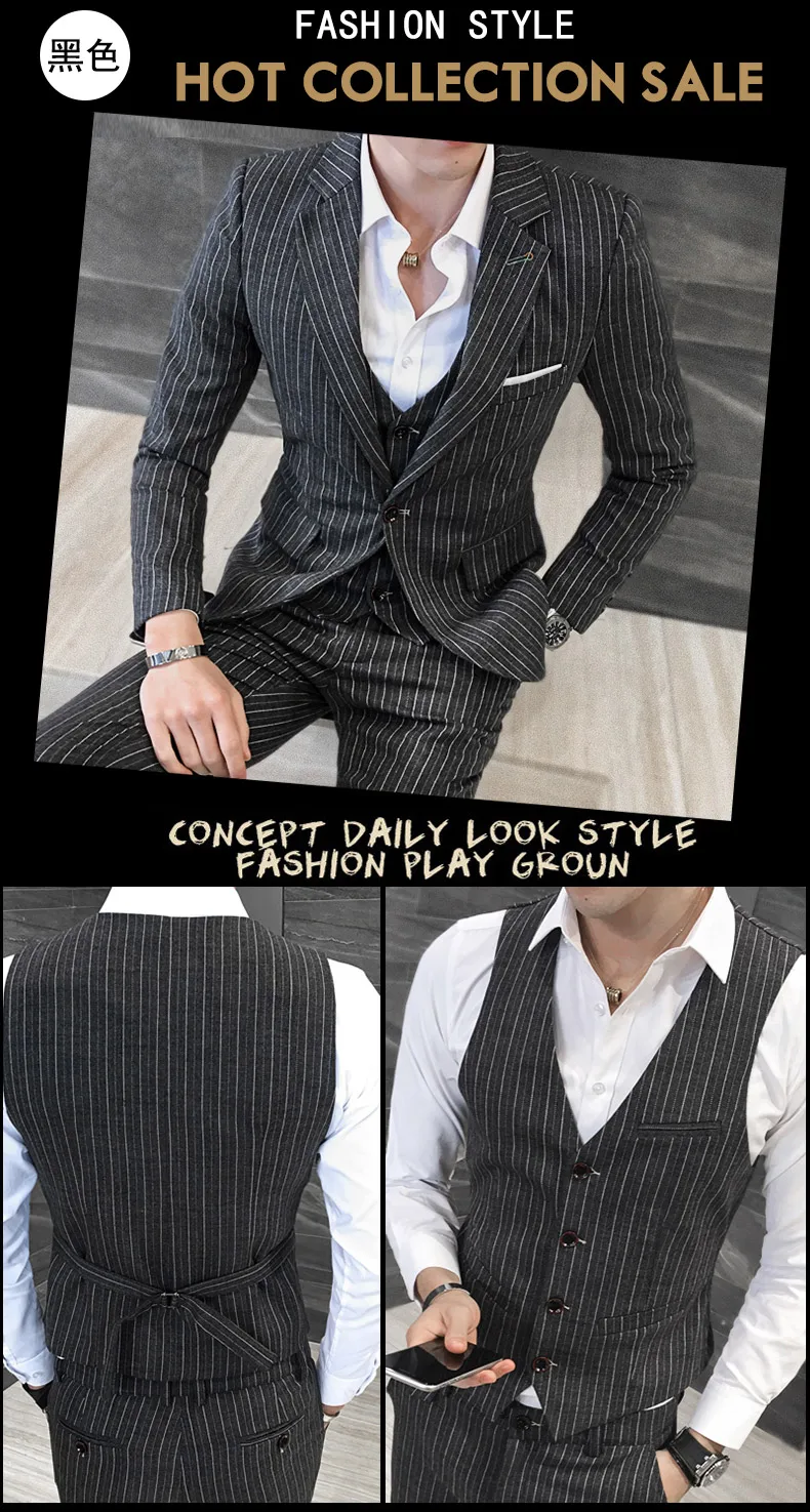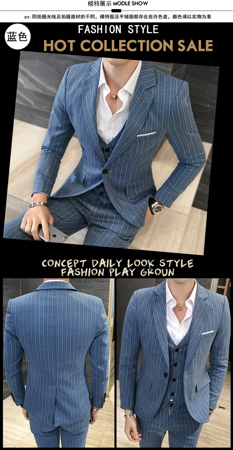 (Куртки + жилет + брюки) Мужской Модный высококачественный деловой костюм в полоску из трех предметов мужское свадебное платье смарт-костюм блейзеры