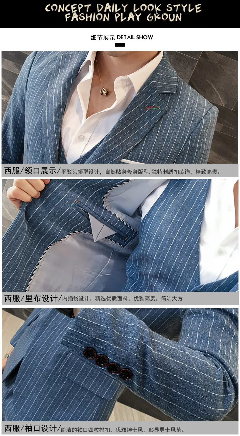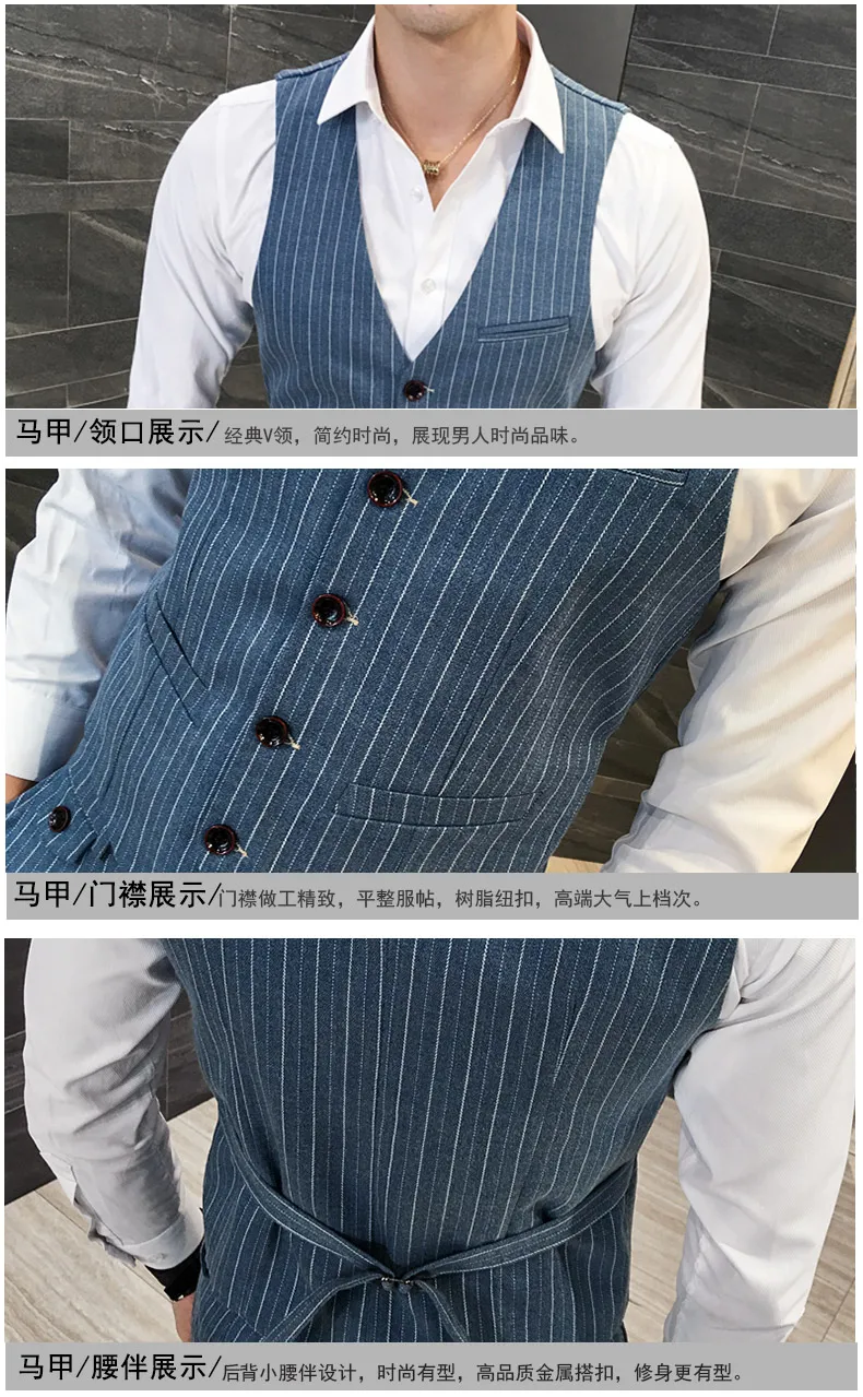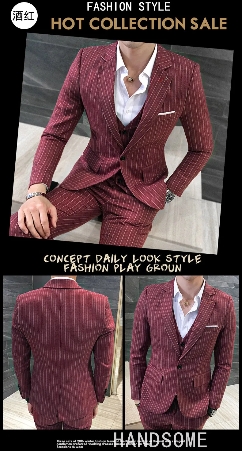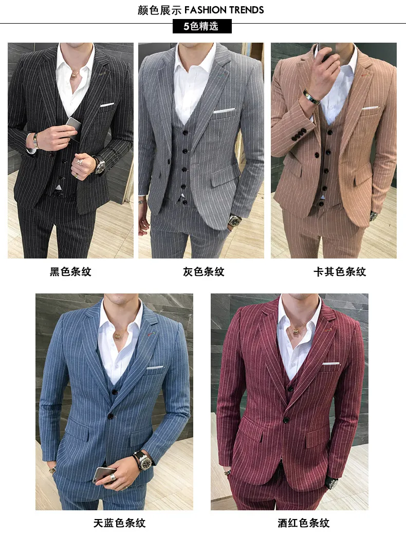 (Куртки + жилет + брюки) Мужской Модный высококачественный деловой костюм в полоску из трех предметов мужское свадебное платье смарт-костюм блейзеры