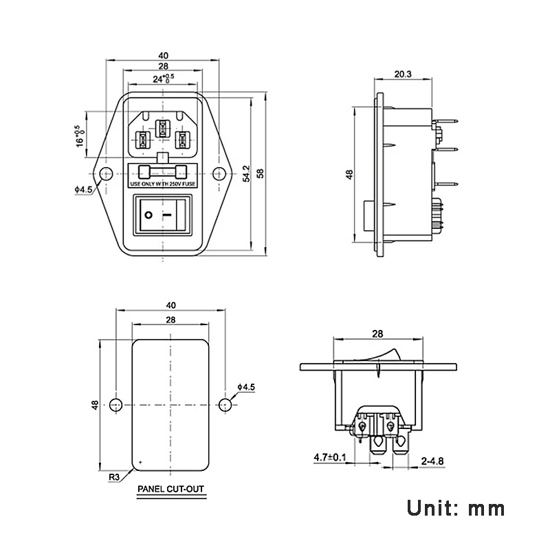 Материал: пластиковый проводящий металл Цвет: черный Номинальное напряжение: 250 В Номинальный ток переменного тока: 10A Тип разъема: 3 pin сопротивление контакта меньше или равна 0,03 МОМ сопротивление изоляции больше или равна 100 МОм Услуги время: отличная не менее 10000 раз выдерживать Напряжение прочность на разрыв: 2000 В переменного тока/мин. Для предохранителей 5*20 (только 250 В) держатель предохранителя: прибл. 0,22*0,09 дюймов/0,55*0,22 см Оптовая Размеры: прибл. 2,28*1,93*1,18 дюймов/5,8*4,9*3 см диаметр монтажного отверстия: прибл. 0,18 дюйма/0,45 см монтажное отверстие от центра до центра Расстояние: прибл. 1,57 дюйма/4 см