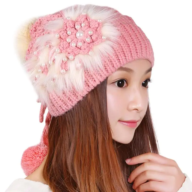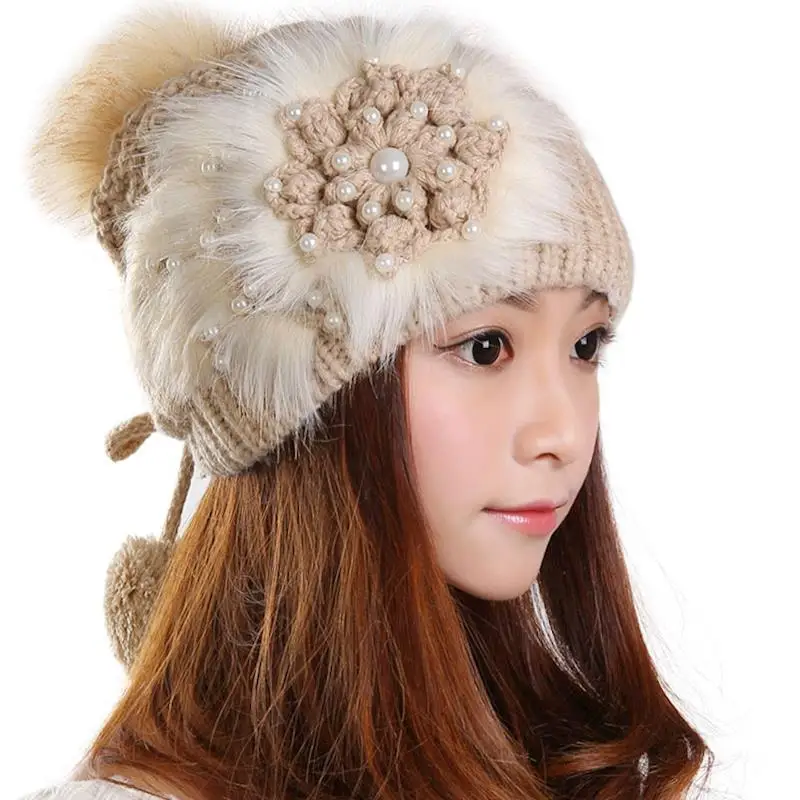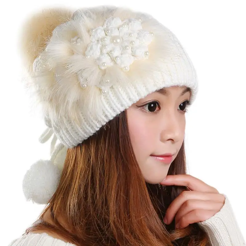 Зимняя шапка, женская вязаная теплая шапка-пудра, зимние шапки из натурального жемчуга для женщин, 2017 теплый берет, плетеная Шапка-бини, шапка