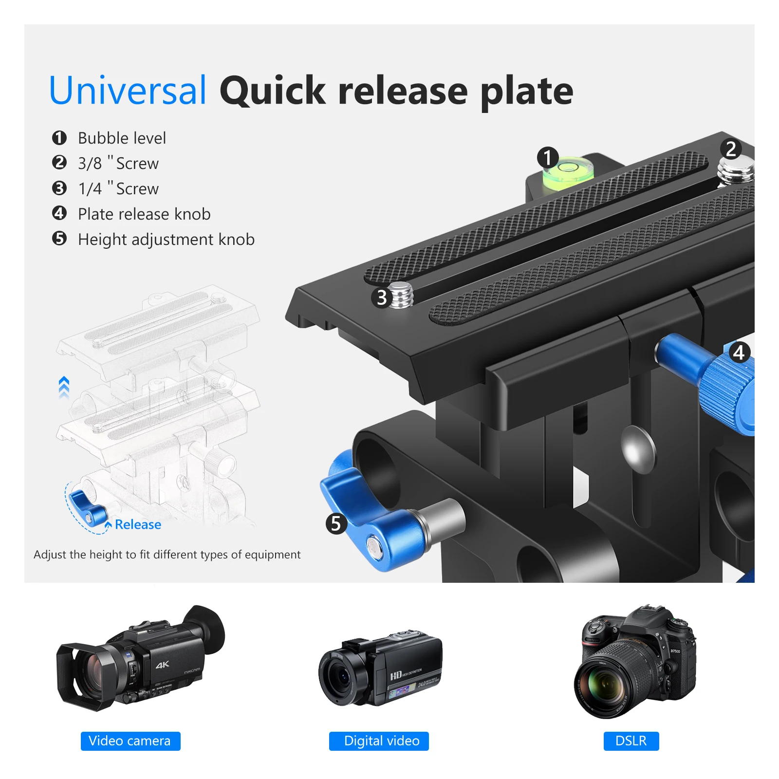 Установите установку на штатив с винтом 1/4 "или 3/8". Включенные рельсовые стержни изготовлены из алюминиевого сплава для обеспечения долговечности. Ручки обеспечивают удобный и безопасный захват для ручной съемки. Кбыстрая release plate с резиновой прокладкой and1/4 "и 3/8» винты для крепления камеры надежно.
