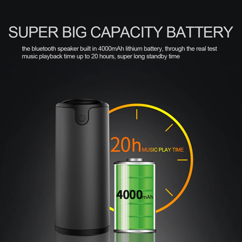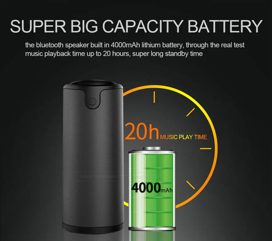 Характеристики продукта: 1). Чипсет bluetooth 4,0, стабильная передача сигнала, мощное декодирование аудио, рабочее расстояние до 10 метров, работает со всеми электронными устройствами с поддержкой bluetooth, включая смартфон, ноутбук, MP3 и т. д. 2). Интегрирован с чувствительной сенсорной панелью управления, переключателем песен, переключателем режимов воспроизведения, регулятором громкости, воспроизведением и паузой. 3). Двойной динамик высокой четкости, 2,0 каналов, 360 градусов, объемный мощный бас и стереозвук HiFi. 4). Поддержка линейного воспроизведения AUX, используйте аудио кабель 3,5 мм для подключения динамика к мобильный телефон или планшетному ПК для воспроизведения музыки, может использоваться как проводной динамик. 5). Поддержка воспроизведения Micro SD-карты, вставьте TF-карту с загруженными песнями для воспроизведения музыки, поддерживает MP3,WMA-формат песен. 6). Встроенный литиевый аккумулятор большой емкости 4000 мАч, чрезвычайно длительный режим ожидания и время использования, время разговора, время воспроизведения до 20 часов. 7). Имеет USB-порт для зарядки, Аккумулятор Емкостью 4000 мАч может использоваться как внешний аккумулятор для зарядки мобильный телефон. 8). Поддержка громкой связи, Встроенный чувствительный микрофон, может отвечать на входящие телефонные звонки, даже когда он воспроизводит музыку или когда вы за рулем.