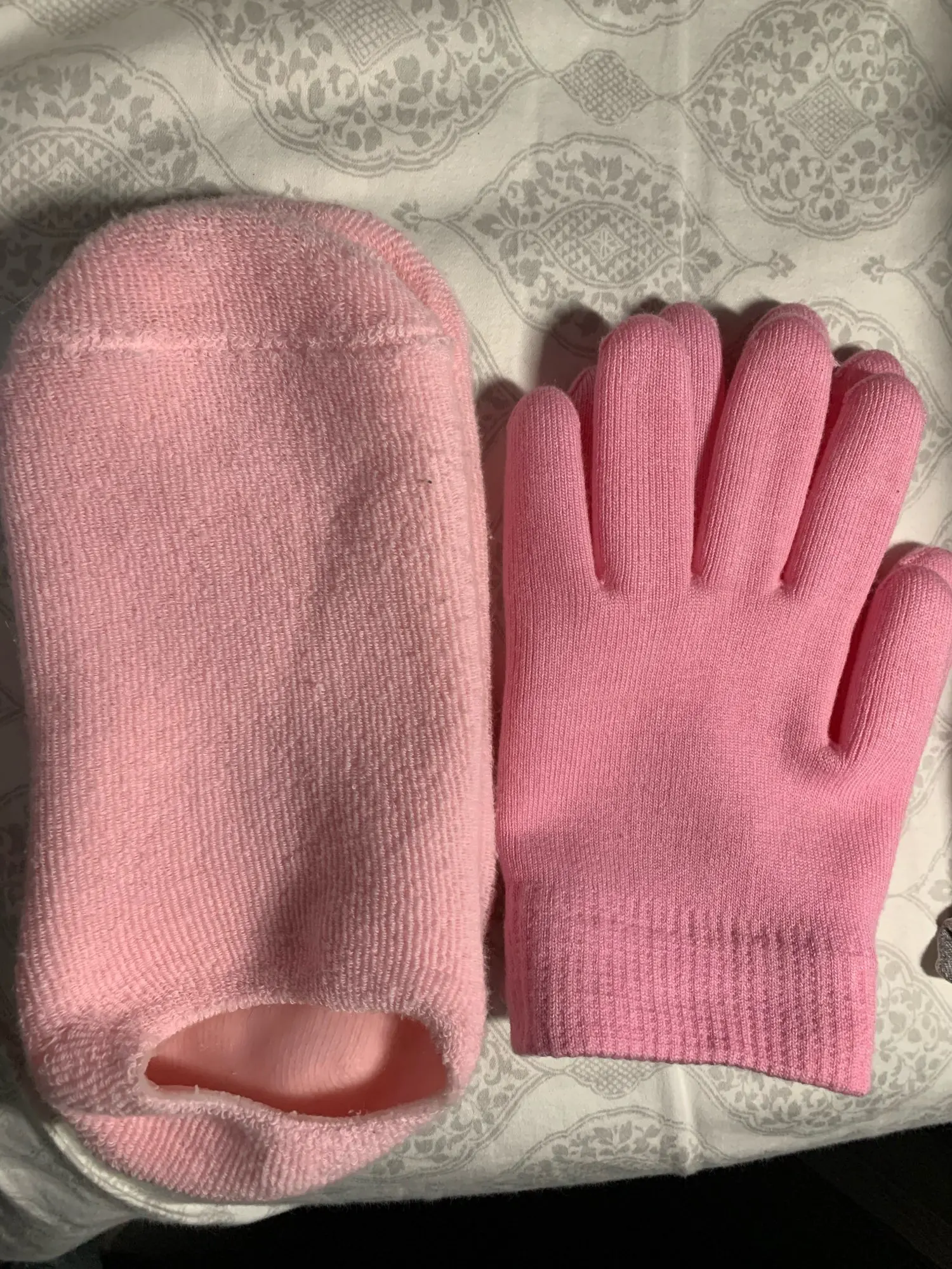 Перчатки и носочки отличаются между собой - разные оттенки розового. Упакованы в отдельные пакеты. Тяжелые - силиконовый слой достаточно плотный. Отличный товар - хороший уход за руками и ногами.