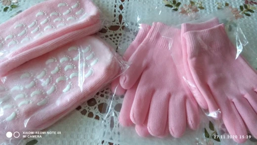 быстрая доставка, взяла носки и перчатки для сухих рук. из-за частого контакта с мылом и дезенфицырущими средствами кожа на руках трескается. перчатки супер, еще буду заказывать для мужа.