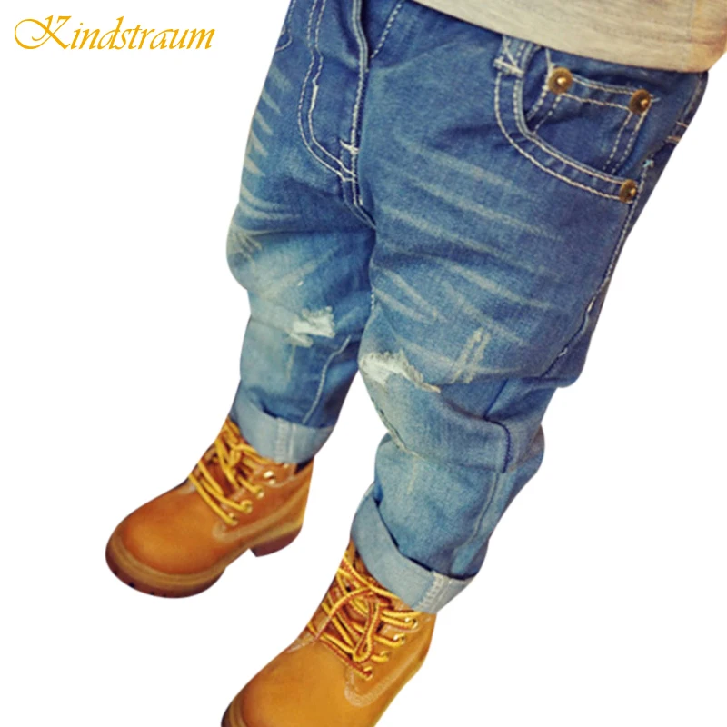 Детские джинсы Kindstraum, модные рваные джинсы для мальчиков и девочек, 2 цвета, повседневные брюки с эффектом потертости, Детские хлопковые джинсовые штаны, MC448, 2020