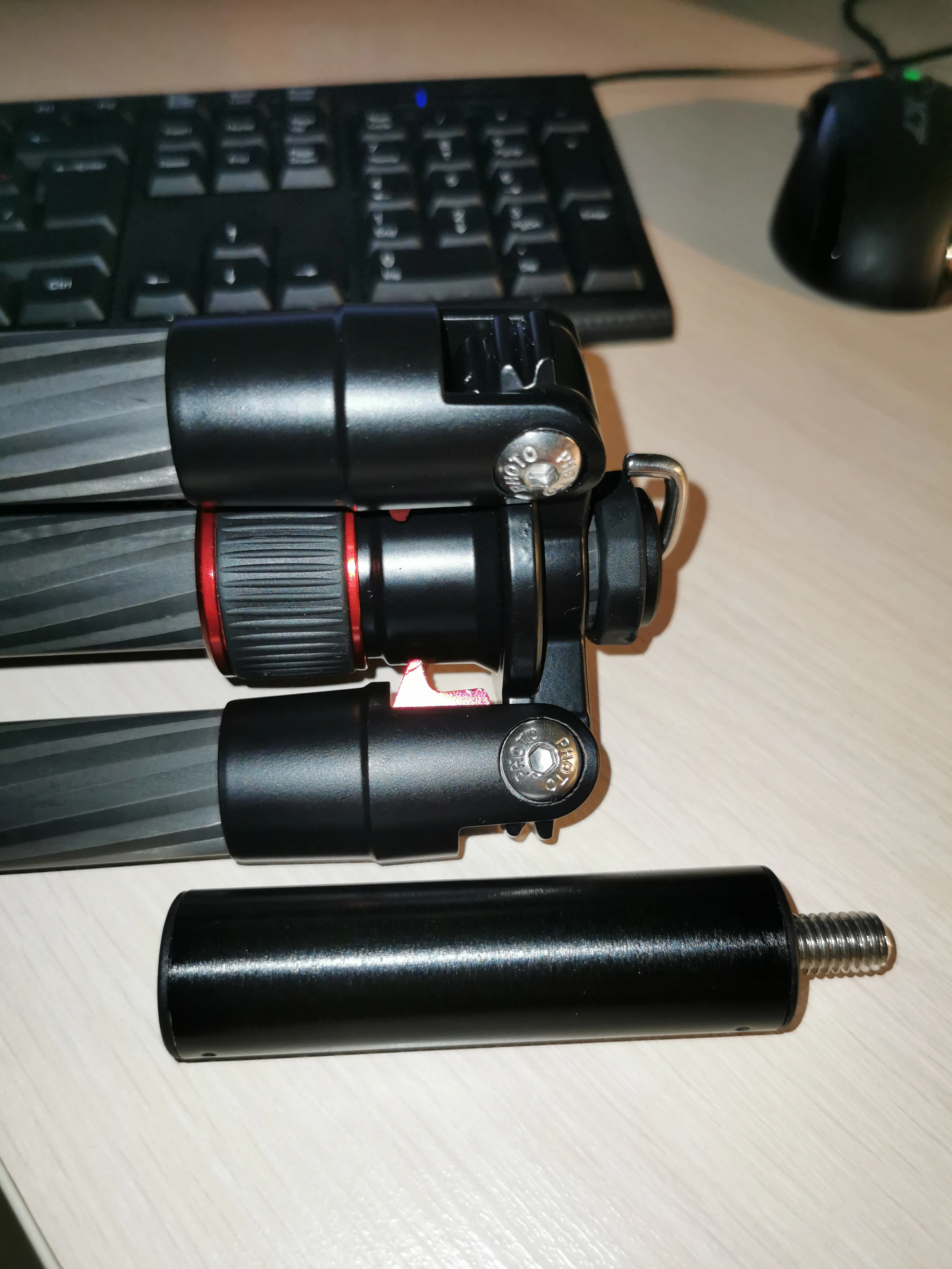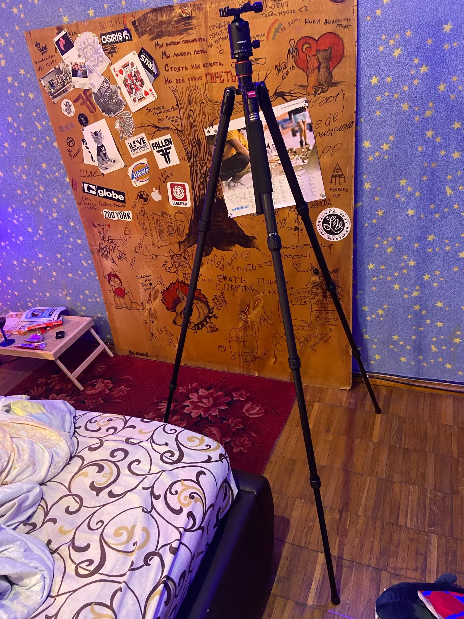 Ножки карбоновые, но это не точно. Шаровая голова алюминиевая, включая шар и весит 500г. Штатив без головы - 1,1кг. На ножках заостренные несъемные металлические упоры. Резиновые пипки выкручиваются и эти упоры прячутся в них. На ветру неустойчив. Есть недокументированная особенность, центральную колонну можно убрать насовсем и использовать штатив без неё. В комплекте есть деталь, которой эта колонна заменяется, трубка 9 см., в нее запрессованы гайки и прилагается шпилька с резьбой. Трубка вставляется вместо центральной колонны и не выступает за пределы сочленения ножек. Площадка, на которую навинчивается шаровая голова, также металлическая. Понравился чехол, это двуслойный материал, с толстой прокладкой между слоями, 4мм примерно. Чехол без надписей. Маловат. Не получится просто свести ножки у штатива и положить его в чехол, не влезет! Нужно обязательно развернуть ножки на 180 градусов (чтобы шаровая голова оказалась между ними) только тогда штатив можно будет туда затолкать.