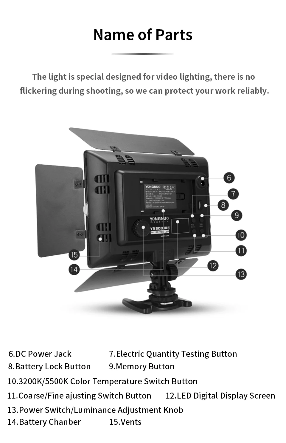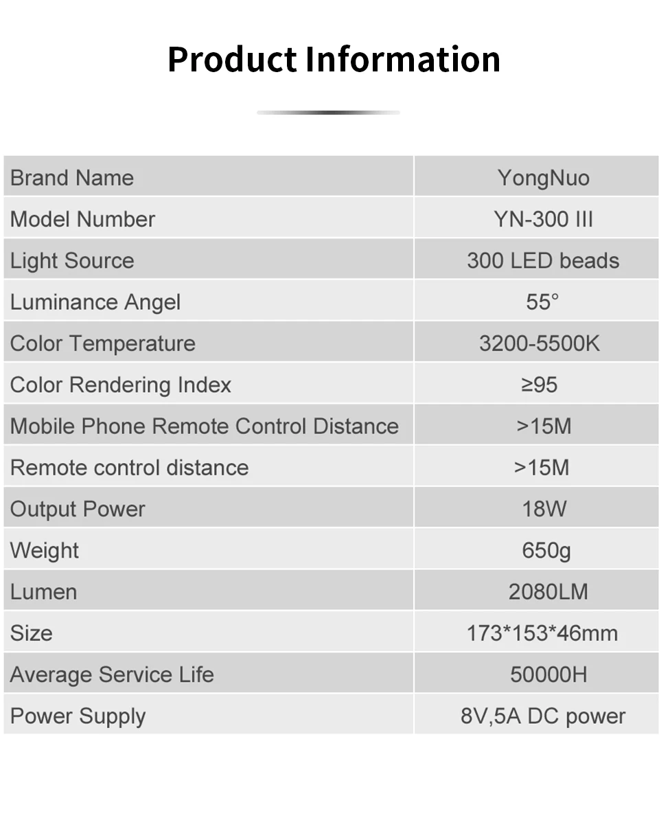 4. YN300 III использует фирменную светодиодную технологию вождения YONGNUO, которая отлично помогает эффективно избежать гофре и стробоскопической вспышки.