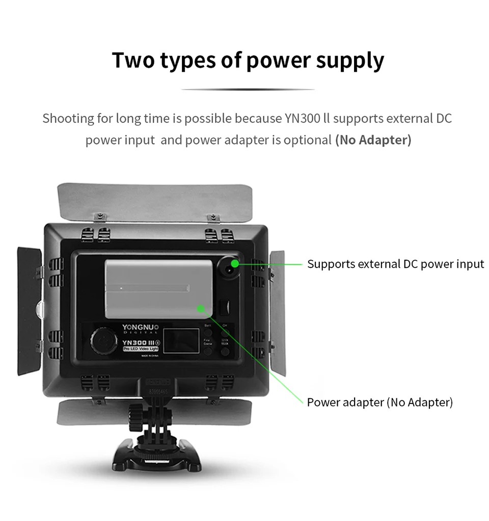 7. Съемка в течение длительного времени возможна, потому что YN300 III поддерживает внешний вход питания постоянного тока (адаптер питания опционально).
