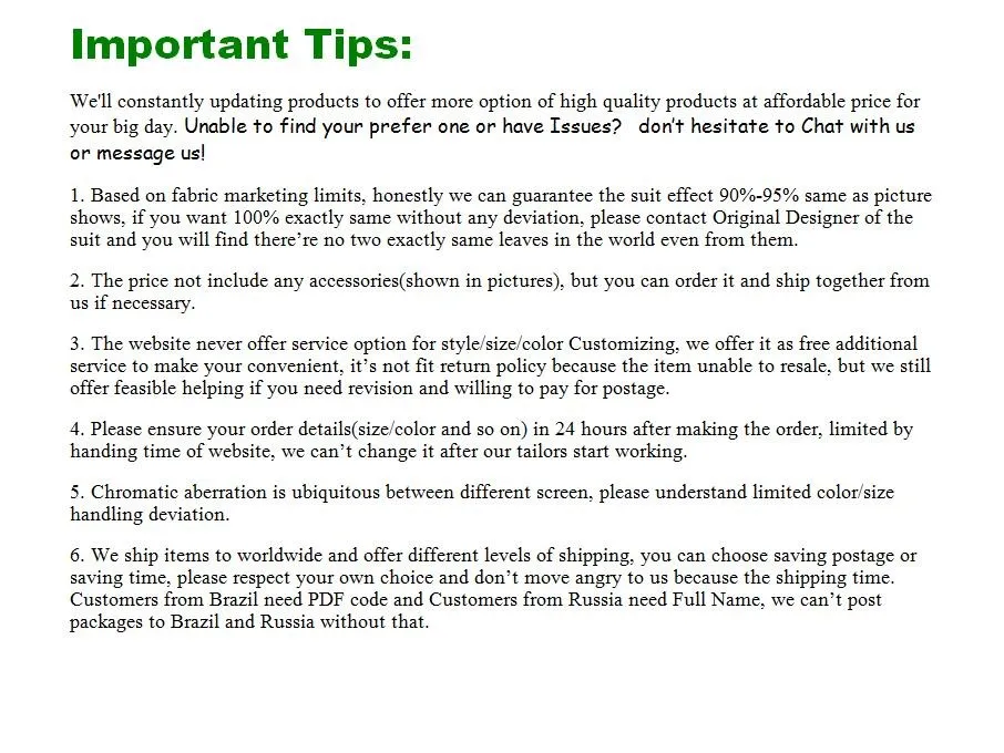 Описание продукта: A.Мы являемся профессиональным производителем, мы всегда предоставляем вам высококачественные, недорогие продукты, добро пожаловать на оптовую продажу. (Все костюмы будут сделаны так же, как на 90%, как на изображении, и галстук имеет только чистый цвет, не может на 100% совпадать с изображением, пожалуйста, поймите.) B. Может быть небольшое различие в цвете между фото и готовым костюмом (это не ошибка), а жилет и галстук имеют только чистый цвет, имеют некоторые отличия с изображением) C. У нас есть собственная фабрика, поэтому вы можете выбрать изготовленный на заказ или изменить цвет для этого костюма, также вы можете отправить вам необъективный костюм ко мне, иСообщите мне свой размер и цвет при заказе. Вы можете смешать заказ в моем магазине. Доставка Мы предоставляем бесплатную доставку в течение 15-45 дней. Если вам нужно быстро получить товар, вы можете выбрать UPS или DHL и другую доставку. Оплата American Express ; Crit Card; Bank to Bank Wire Transfers; Western Union. Ввозные таможенные пошлины TОси и расходы не включены в стоимость товара или стоимость доставки. Эти расходы являются обязанностью покупателя. Пожалуйста, свяжитесь с таможней вашей страны, чтобы определить, какие дополнительные расходы будут до торгов/покупки.