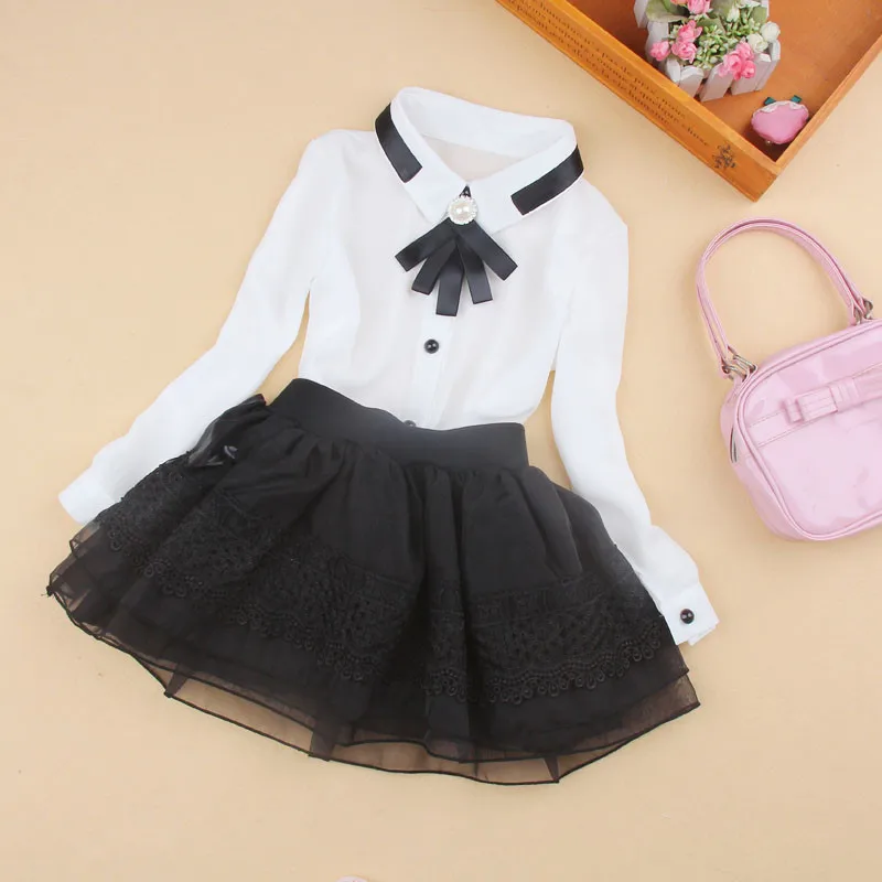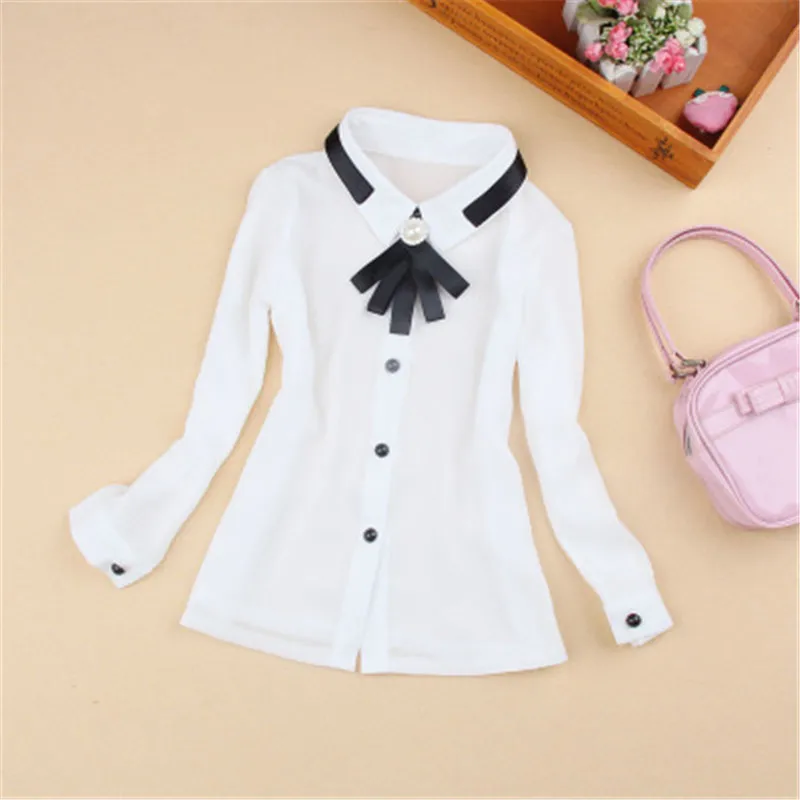 В 2017 году, весенне-осенние шифоновые блузки с длинными рукавами и бантом и жемчугом Школьная блузка для девочек топы, белые рубашки для девочек AA2109