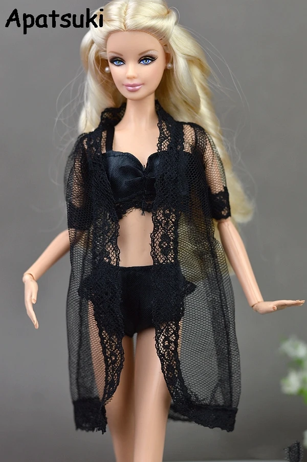 1 комплект, аксессуары для кукол, черное сексуальное женское белье, пижама, ночное белье, кружевное длинное пальто, Ночная одежда + бюстгальтер + нижнее белье, Одежда для куклы Барби