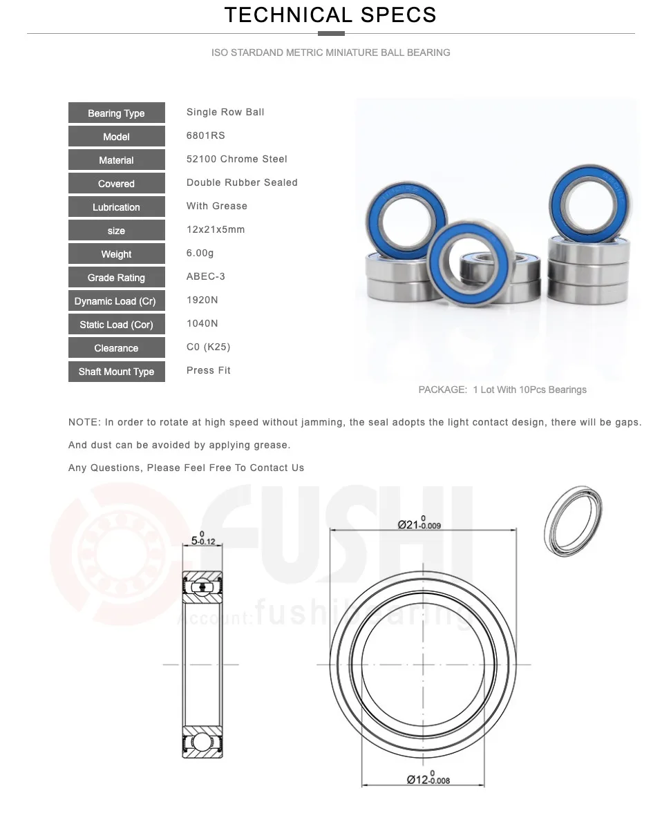 6801RS подшипник ABEC-3 (10 шт.) 12*21*5 мм тонкая секция 6801-2RS шарикоподшипники 61801 RS 6801 2RS с синей герметичной L-2112DD