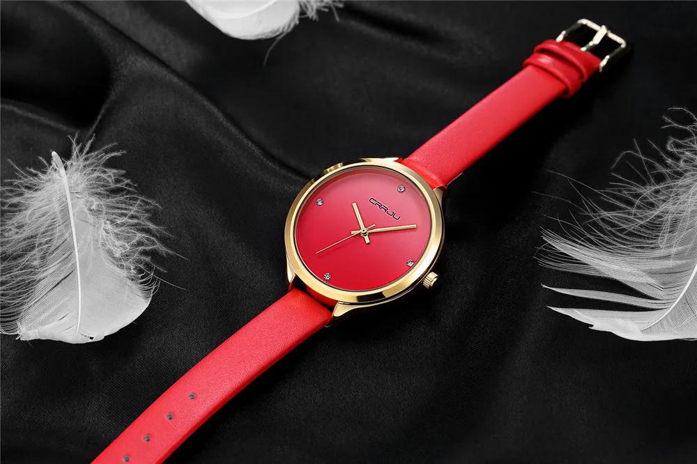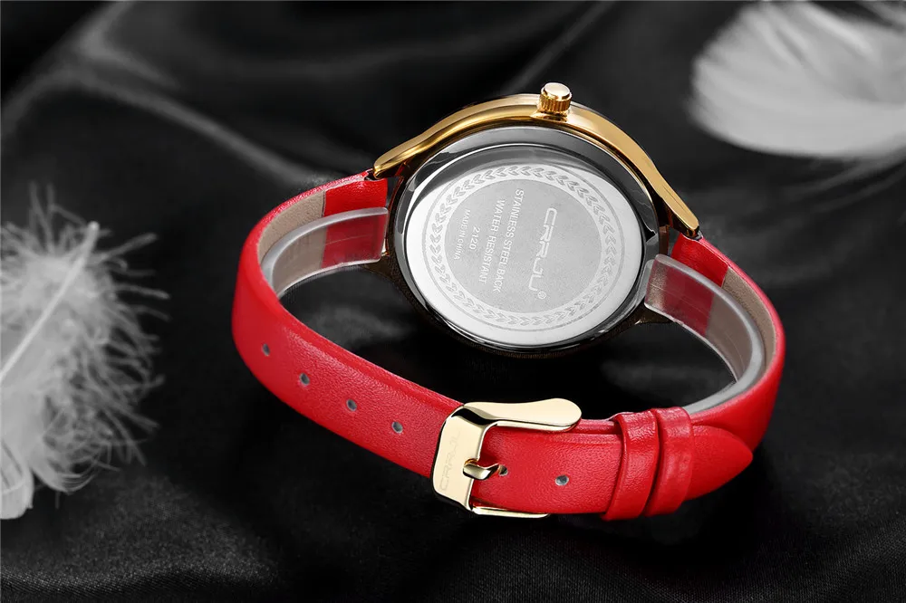 Часы наручные CRRJU женские кварцевые, брендовые модные деловые, с красным кожаным ремешком