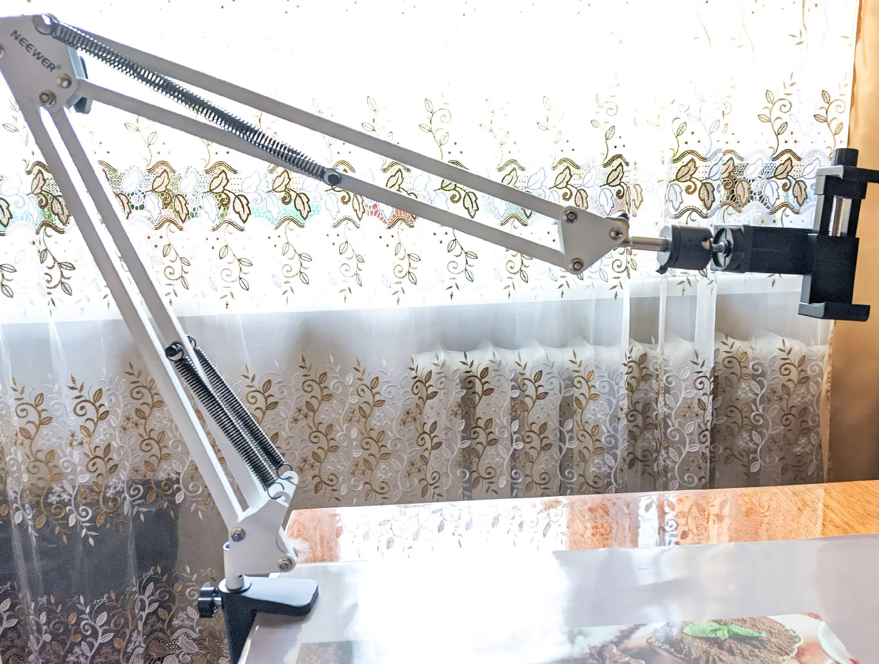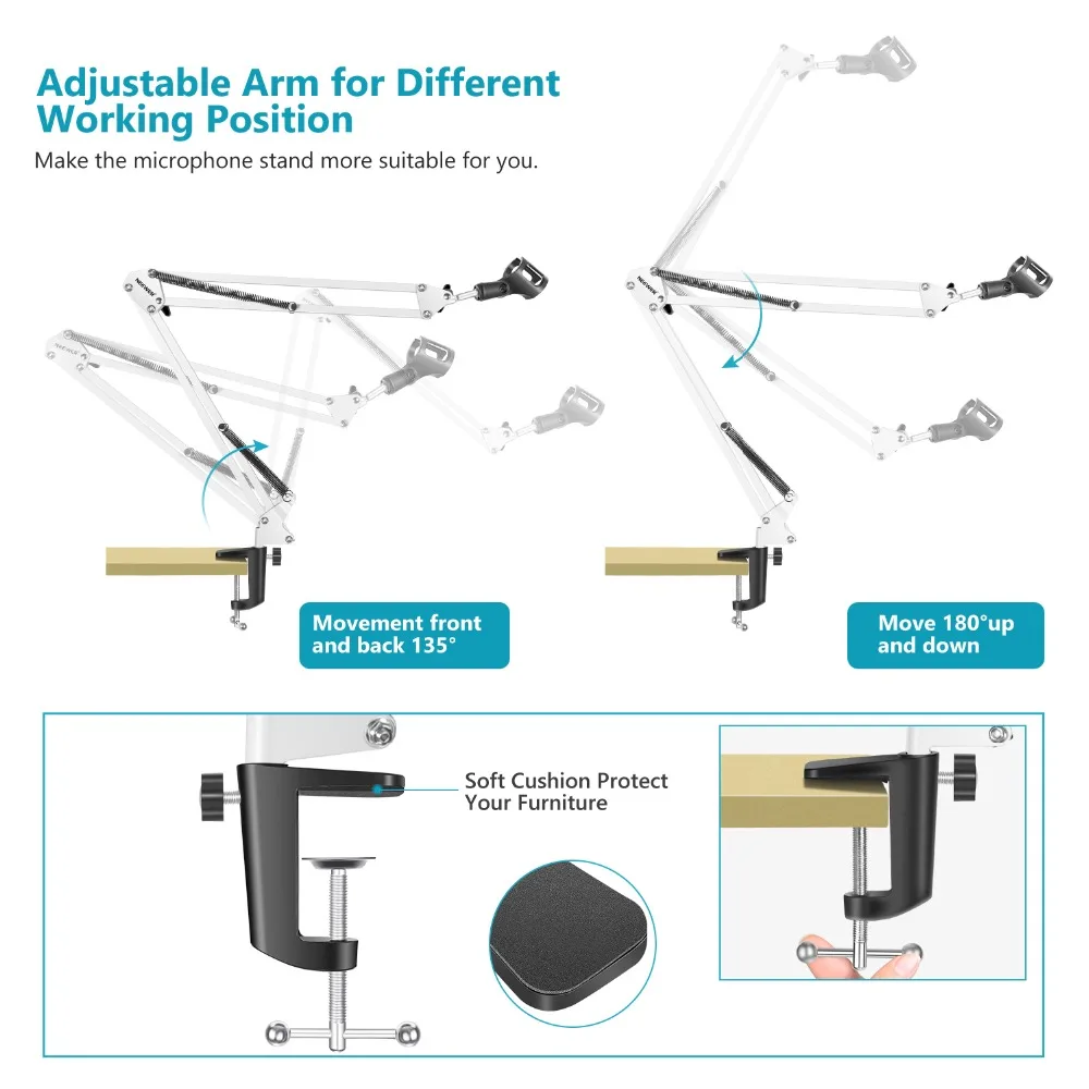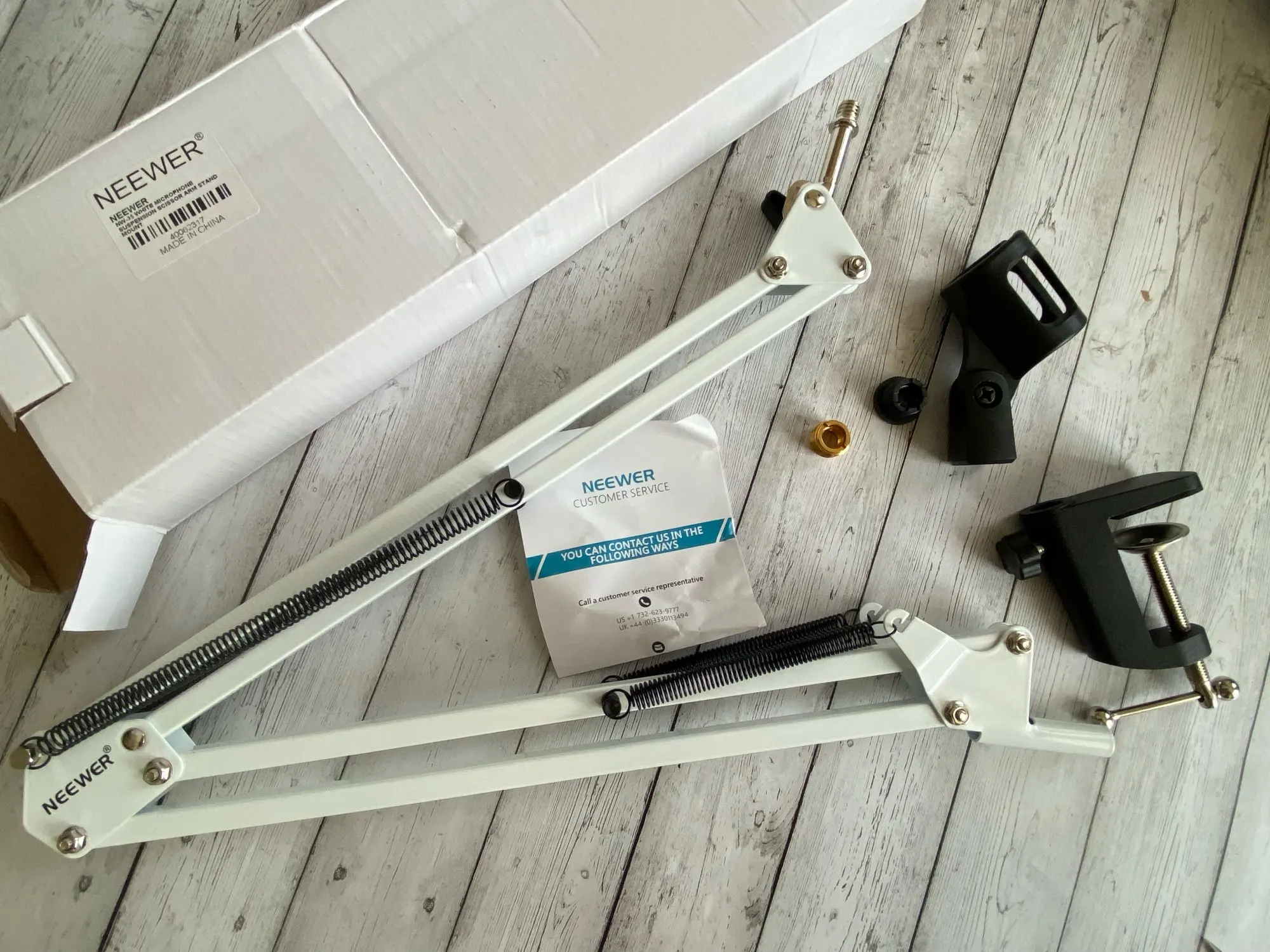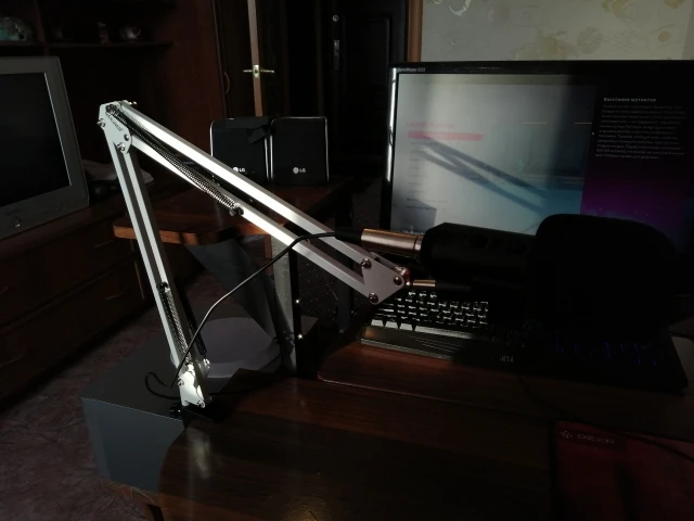 За свои деньги отличный пантограф. Струбцина цельная, а не приклеенная что очень хорошо. НО! Если будете ставить конденсаторный микрофон то лучше докупите потом пвука (паук для микрофона). Так как прижины при малейшем задевании выбрируют и создают шум в микрофоне. Как вариант обвязать верхние пружыны какой нибудь тряпкой чтоб не было выбрации. И не пугайтесь. Вибрация это проблема всех пантграфов. По этому паука и ставят. Пантограф советую к покупке!