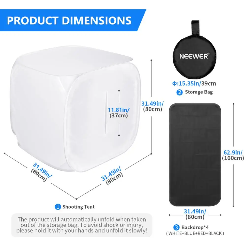 Размер 32 "x 32" x 32 "с большим передним отверстием делает съемки в студии простыми. Также в комплект входит дополнительное переднее покрытие с разрезом объектива/камеры для полного окружения вашего предмета. Кроме того, мы включили 3 очень большие цветные простыни для внутреннего моделирования (красный, синий, черный и белый). Весна похожая на деревянную раму позволяет устройству будет сложить и хранить в прилагаемом носить чехол для очень легкой транспортировки и хранения.